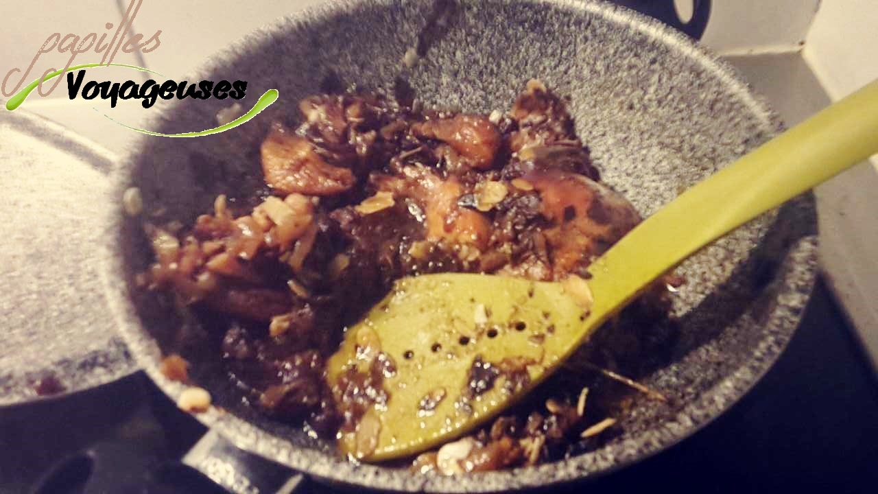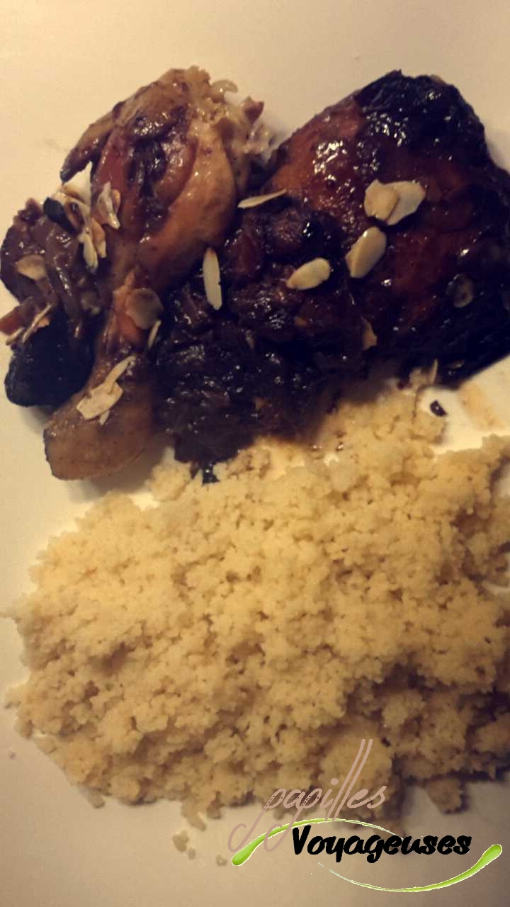 - Choisir un grand récipient dans lequel vous allez faire mijoter toute la préparation et y mettre : le poulet, les raisins secs, les oignons, les pruneaux. Recouvrir le tout d’eau (disons environ 500ml) et laissez cuire à feu doux au moins 1h à couvert (plus vous laissez le feu doux longtemps plus la viande sera tendre) puis sans couvercle à la fin pour laisser épaissir la sauce (le temps d’épaississement dépend de l’eau que vous avez mis au départ dans la préparation donc c’est à l’œil que vous jugerez de la bonne consistance de la sauce, attention à ne pas tout brûler!!).