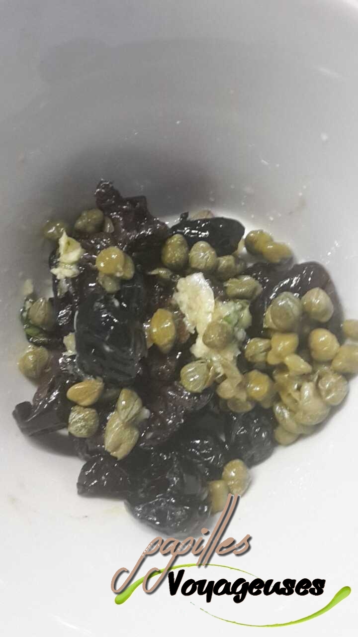 - Si les olives ne sont pas dénoyautées, les dénoyauter. Mettre les olives dans un bol,y ajouter les câpres, et l’ail préalablement coupé finement.