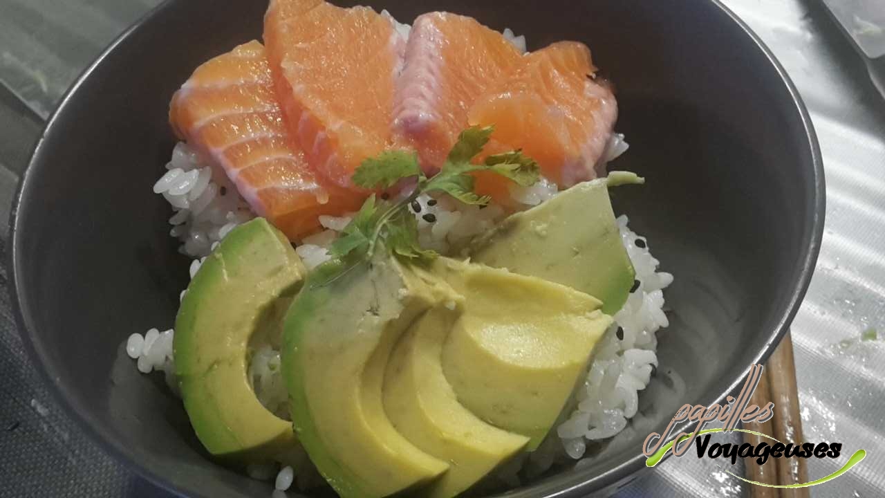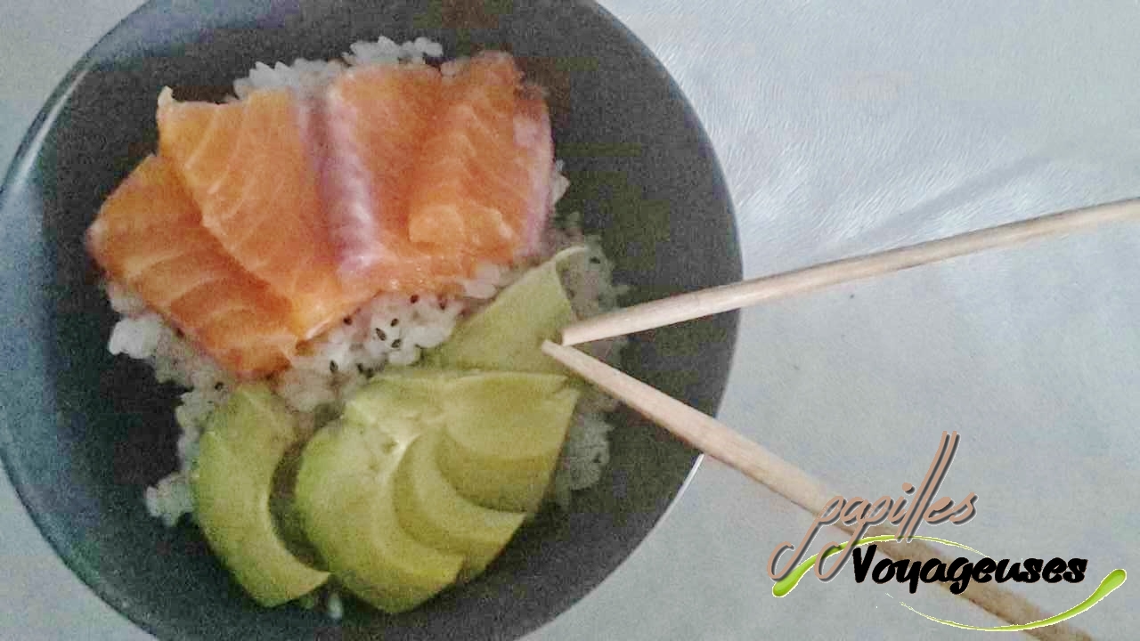 Bon, moi je l’ai fait uniquement au saumon cru et à l’avocat, mais vous pouvez ajouter du concombre, ou mettre autre chose que du saumon ( exemple: saumon cuit, thon cuit ou cru, daurade crue, crevette cuite…). Vous pouvez y mettre aussi de l’omelette japonaise ! (recette prochainement mis en ligne)
