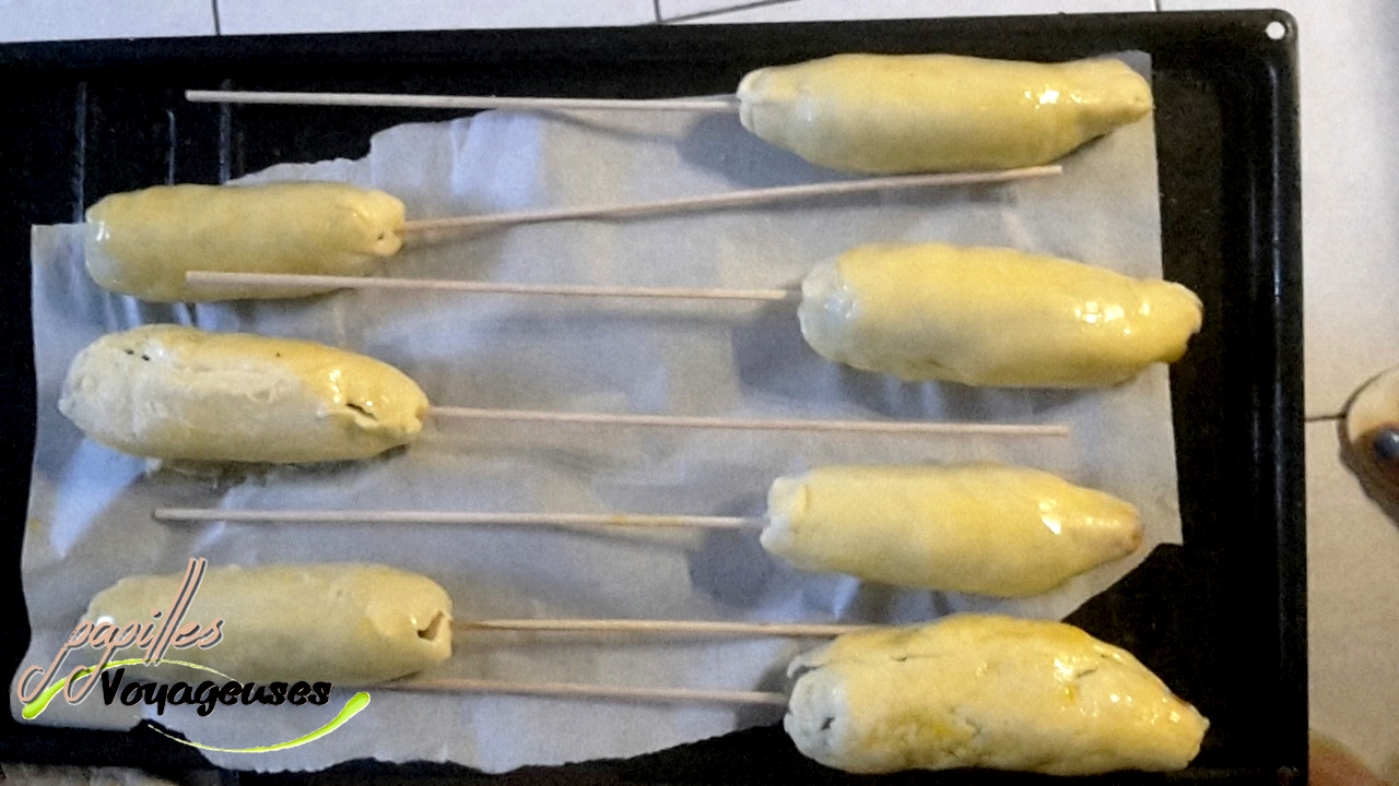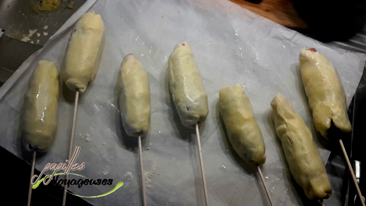 - Entourer le cornichon de pâte en faisant le moins possible de plie (attention, il faut bien refermer la pâte car lors de la cuisson, la pâte peut s’ouvrir en gonflant).