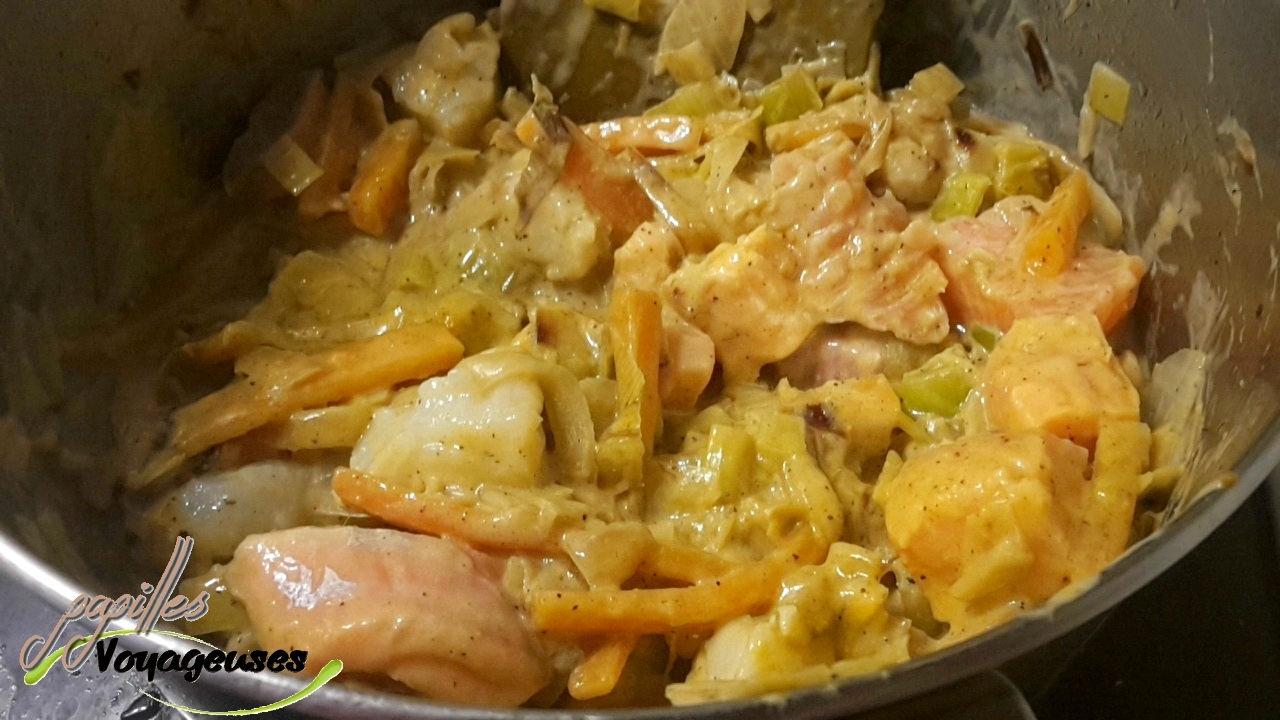 - Dans une casserole faire revenir dans un peu d’huile ces légumes, puis une fois légèrement coloré, ajouter le vin blanc et la crème liquide, le poivre, le curcuma et le curry.