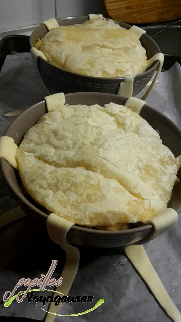 - Pendant que les légumes cuisent, préchauffer le four à 210° et découper des ronds à l’aide d’un emporte-pièce de la taille du fond et du dessus de vos bols. Personnellement pour le fond j’ai utilisé un petit verre pour couper la pâte, et pour le dessus j’ai coupé directement la pâte avec le bol.