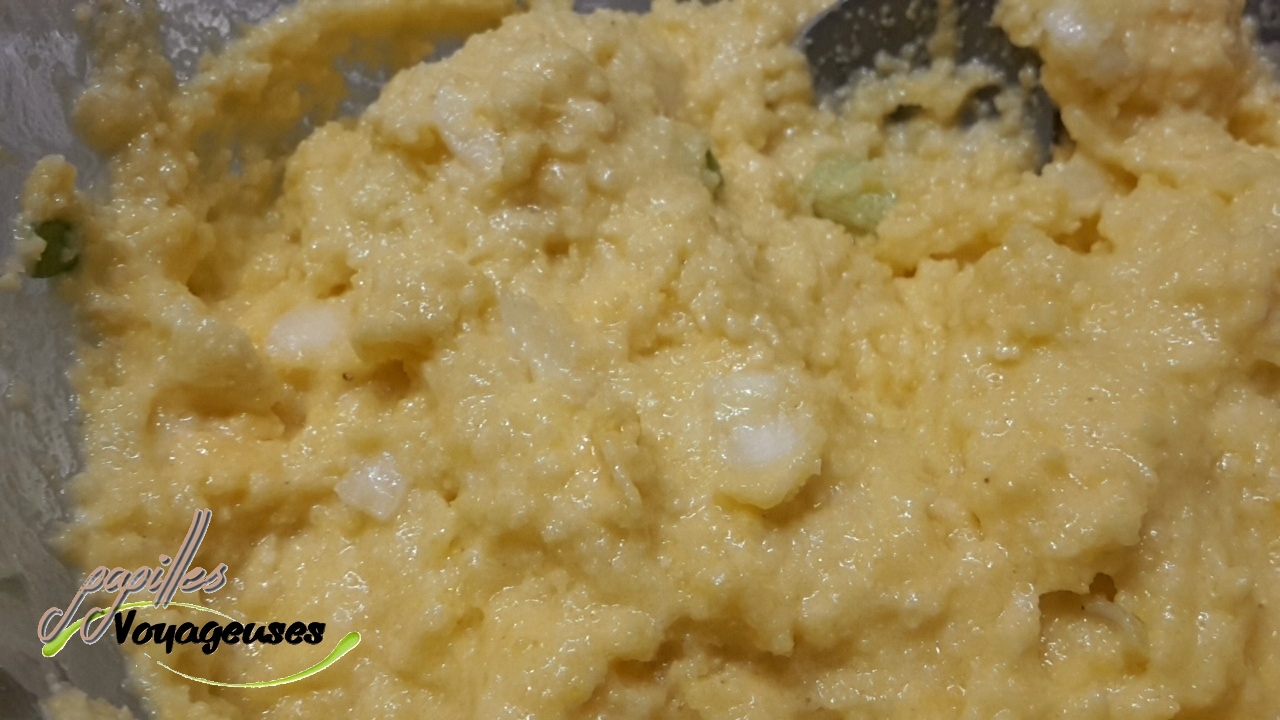 - Dans un grand récipient, verser la polenta, la farine, la levure, le sucre, le sel, le bicarbonate de soude, les oignons et le fromage puis mélanger.