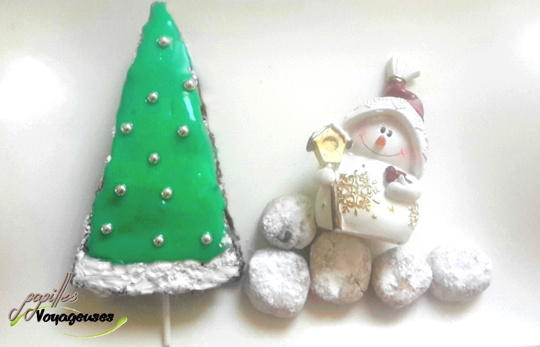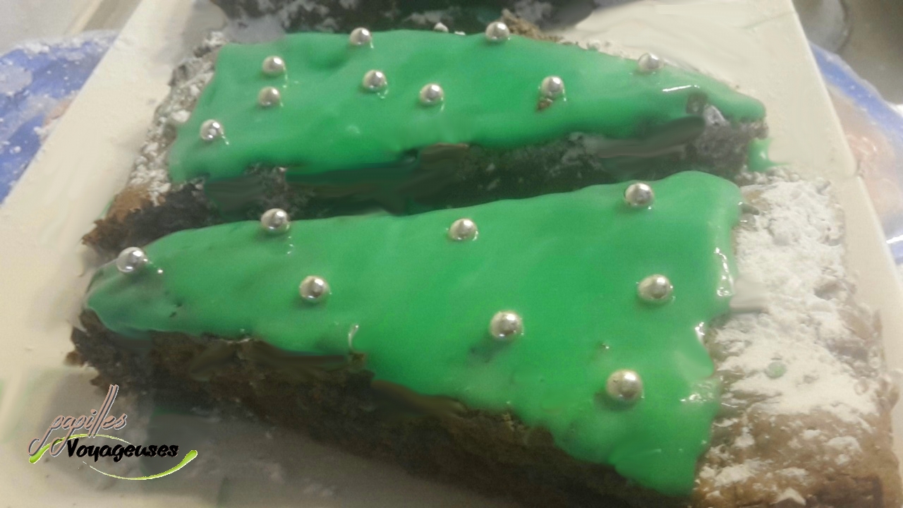 - Lorsque le brownie sera froid, le démouler, puis le découper en petits triangles, la dimension dépend de votre moule, donc calculer bien afin de ne pas faire trop de déchets (j’ai fait des gros triangles pour avoir des gros sapins mais pour servir il vaut mieux en faire des plus petits).
