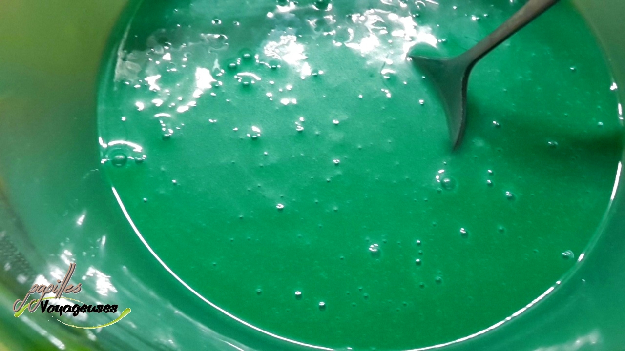- Une fois le chocolat blanc fondu, mettre dans un bol le mélange crème miel et y ajouter le chocolat blanc et du colorant vert (ou jaune+bleu jusqu’à obtention d’une belle couleur verte) puis mettre au frais.
