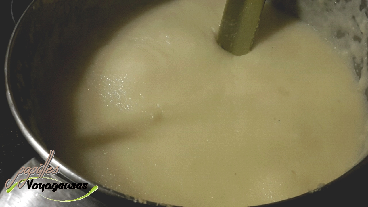 - Une fois que le mélange bout, ajouter en pluie légère la semoule. Laisser cuire le temps indiqué sur le paquet, remuer fréquemment pour éviter que le mélange accroche. Attention il ne doit pas y avoir de grumeaux.