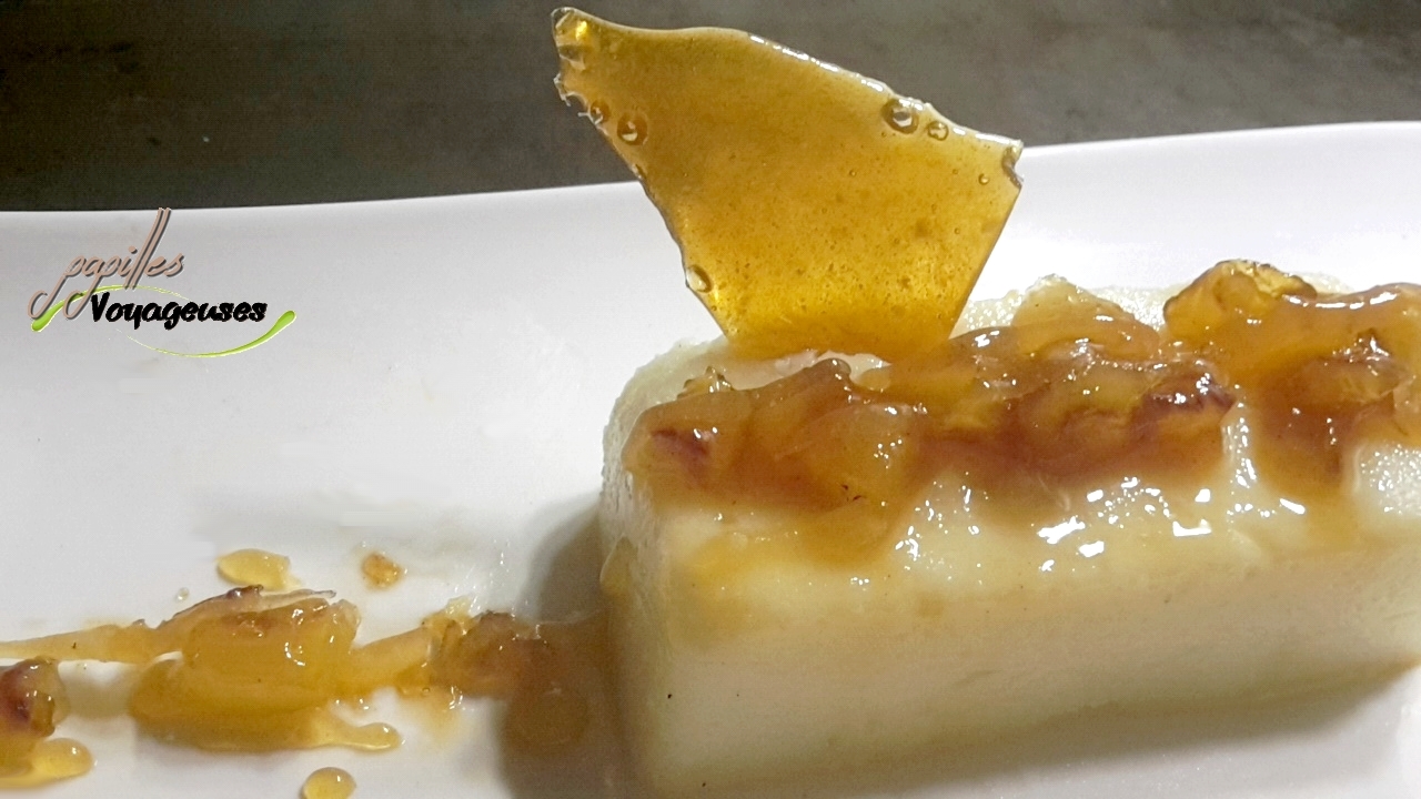 - FACULTATIF : Avant de servir, couper en petits morceaux les pommes puis les faire revenir dans une poêle avec une cuillère à soupe d’eau puis une fois les pommes colorées, ajouter 2 cuillères à soupe de sucre par pomme (donc 12 si vous avez 6 invités). Une fois bien caramélisés, poser sur vos parts de gâteau puis préparer un caramel en versant le reste de sucre dans une poêle jusqu’à ce qu’il ait une belle couleur dorée (attention, même s’il reste un peu de sucre sortir du feu et remuer afin de faire tout fondre, il ne faut surtout pas que le caramel soit trop cuit). Vous pouvez finir par napper vos parts de gâteau avec le caramel. J’ai mis un peu de caramel sur du papier cuisson afin de décorer mon dessert.