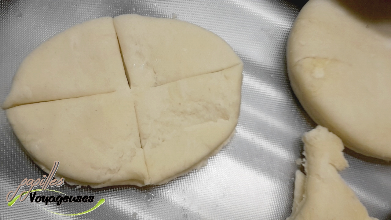 - Faire 4 incisions au couteau sur chaque rond de pâte comme sur la photo.