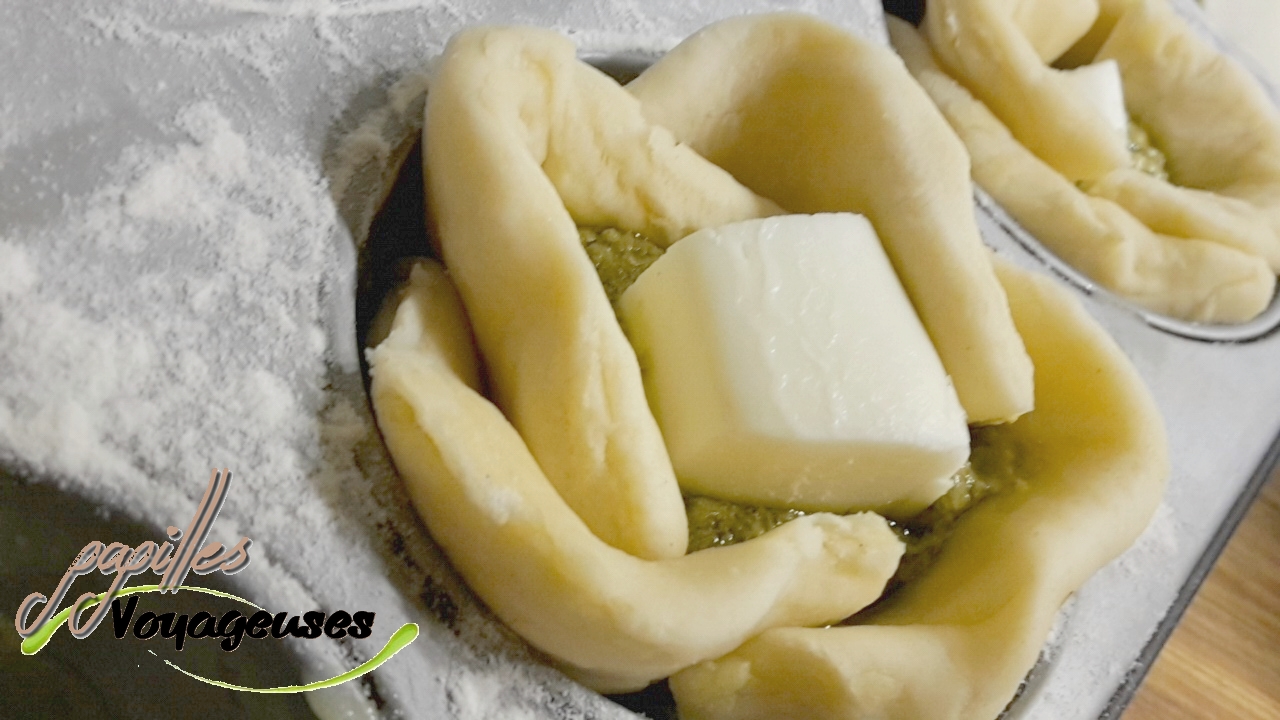 - Disposer au centre une cuillère à café de pesto puis un cube de 1,5cm sur 1,5cm environ, rabattre les pétales de votre rose puis déposer dans un moule à muffin afin qu’elles ne s’ouvrent pas lors de la cuisson.