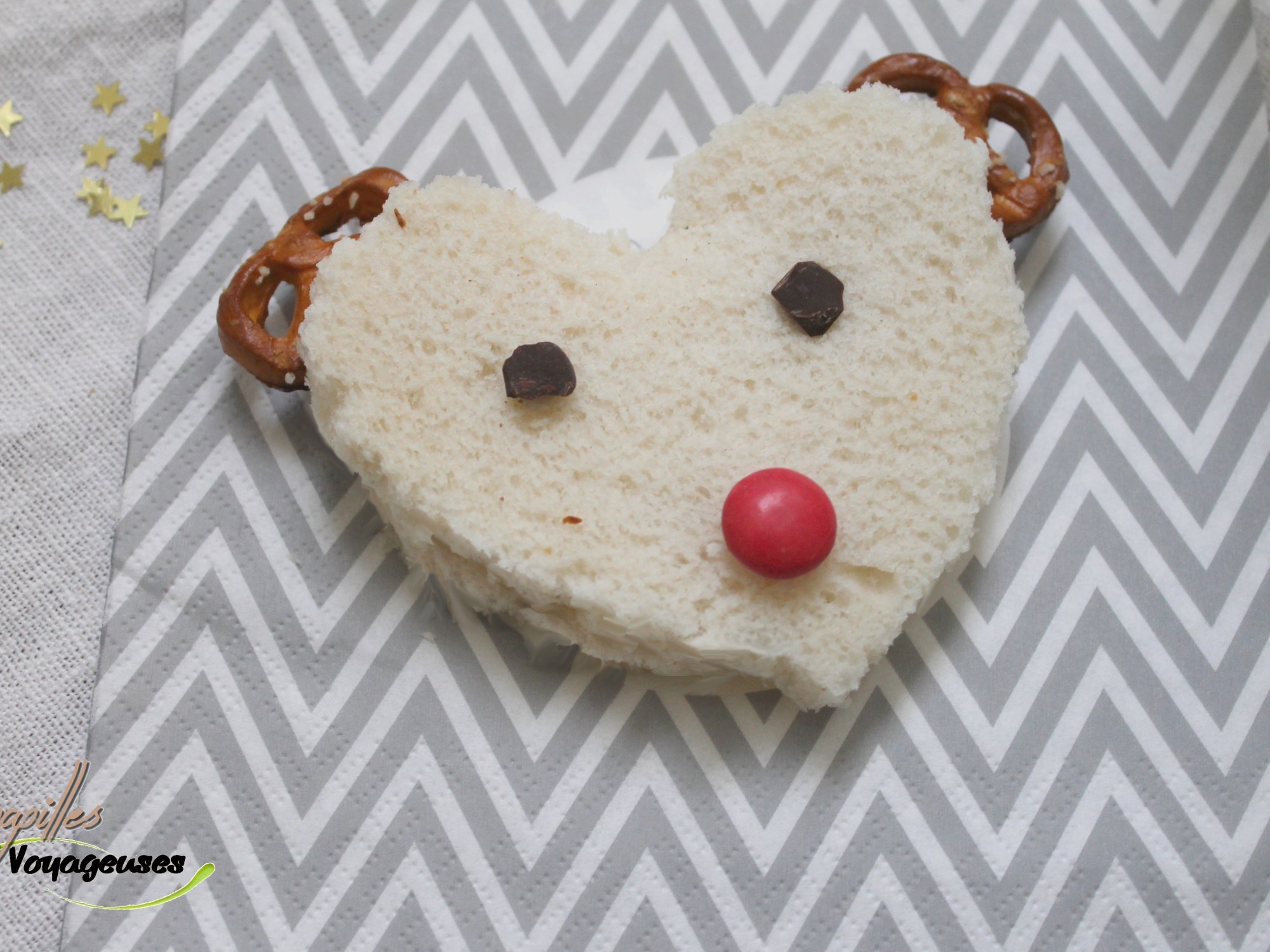 - Refermer le sandwich et déposer deux pépites de chocolat pour les yeux et un M&M’s rouge pour le nez.