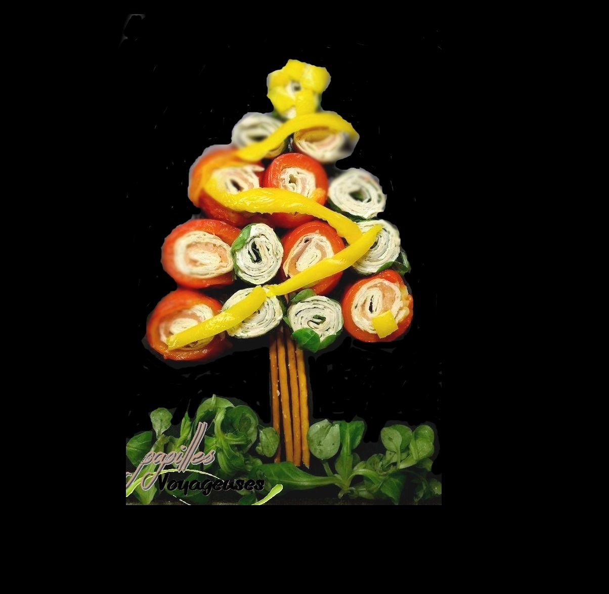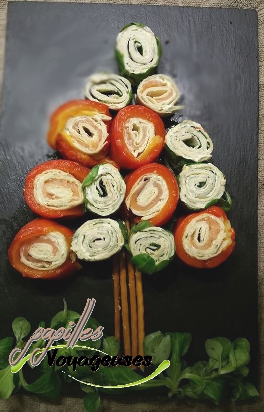 - Disposer chaque bouché dans une belle et grande assiette, commencer par une bouchée en haut du sapin, puis deux, en alternant les deux sortes. Terminer par créer le pied du sapin avec des bretzels.
