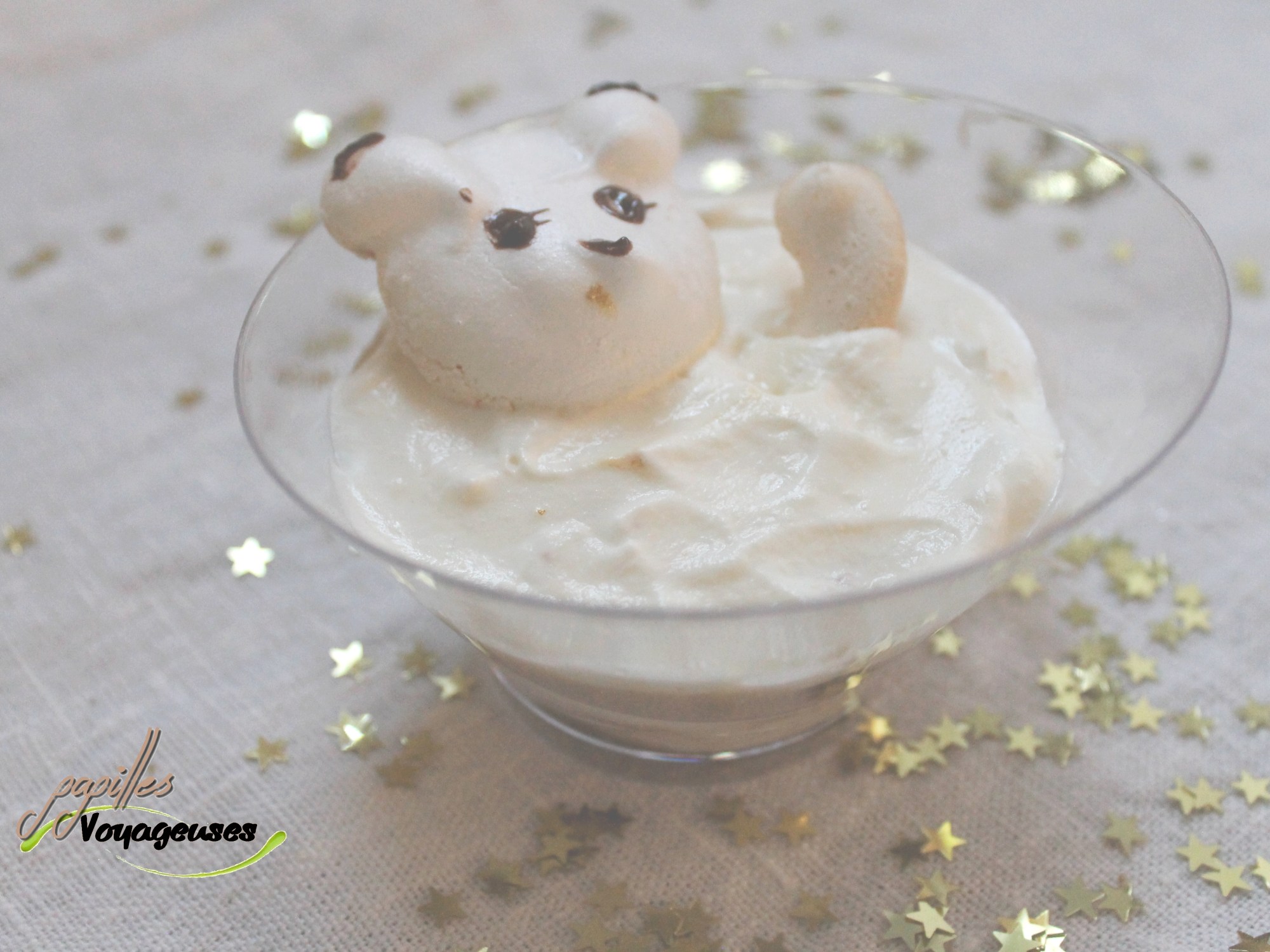 - Faire les monter les blancs en neige puis dès qu’ils sont presque prêts, incorporer petit à petit le sucre blanc en continuant de fouetter. Une fois la préparation lisse et brillante vous devez obtenir le « bec d’oiseau » comme sur la photo. Vous pouvez ainsi remplir une poche à douille de ce mélange et former vos meringues. Il vous en faudra des petites pour les disposer dans le fond de vos verrines. J’en ai également fait en forme de tête d’ours, il suffit donc de faire un rond plat et de finir sur le museau pour qu’il ressorte un peu plus, puis j’ai fait deux autres petits rond de chaque côté pour faire les oreilles! J’ai fait également des petites pattes comme des petites virgules. Enfourner à 90° environ 20mn. Les meringues ne doivent pas colorer (elles le seront forcément un peu à la base)