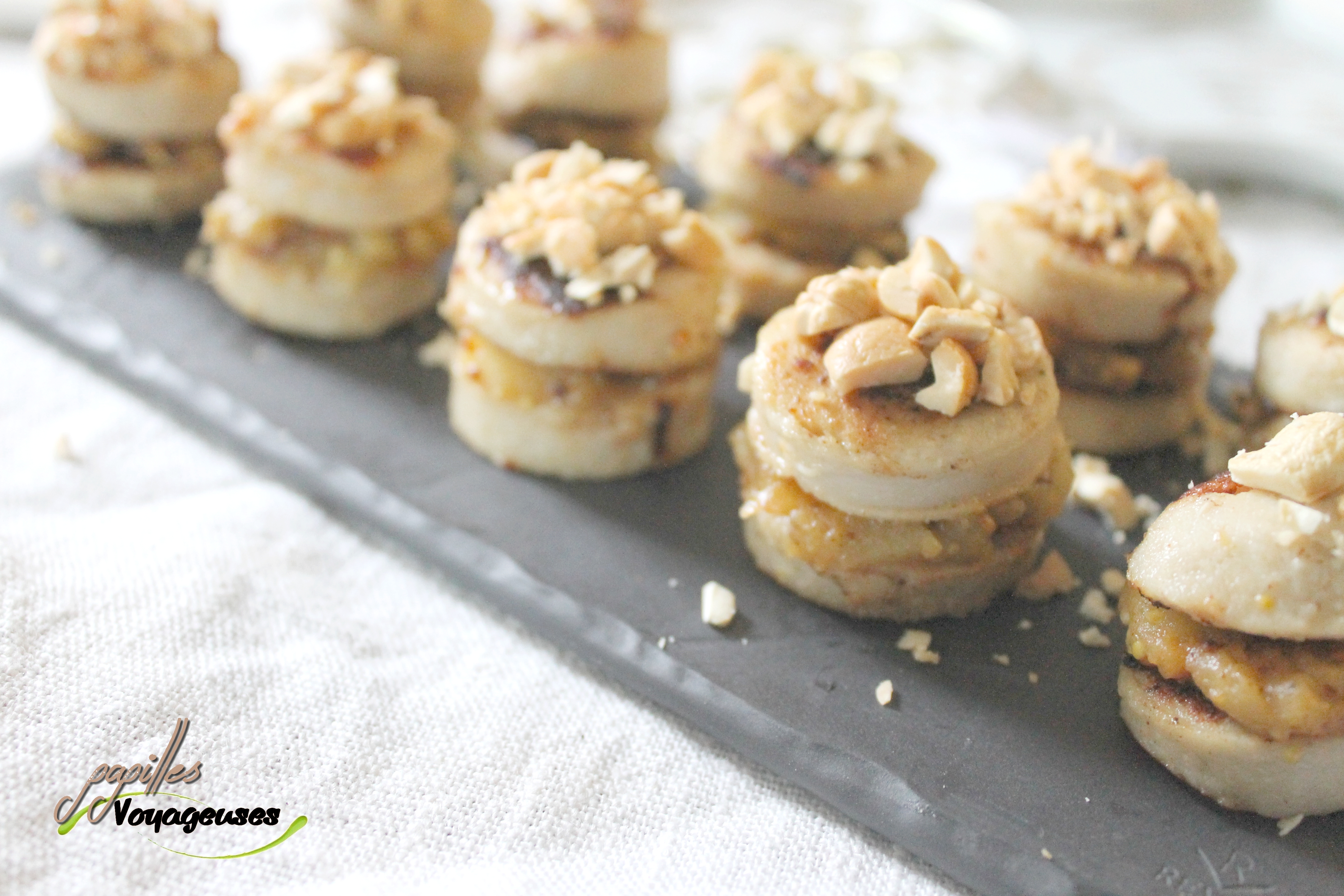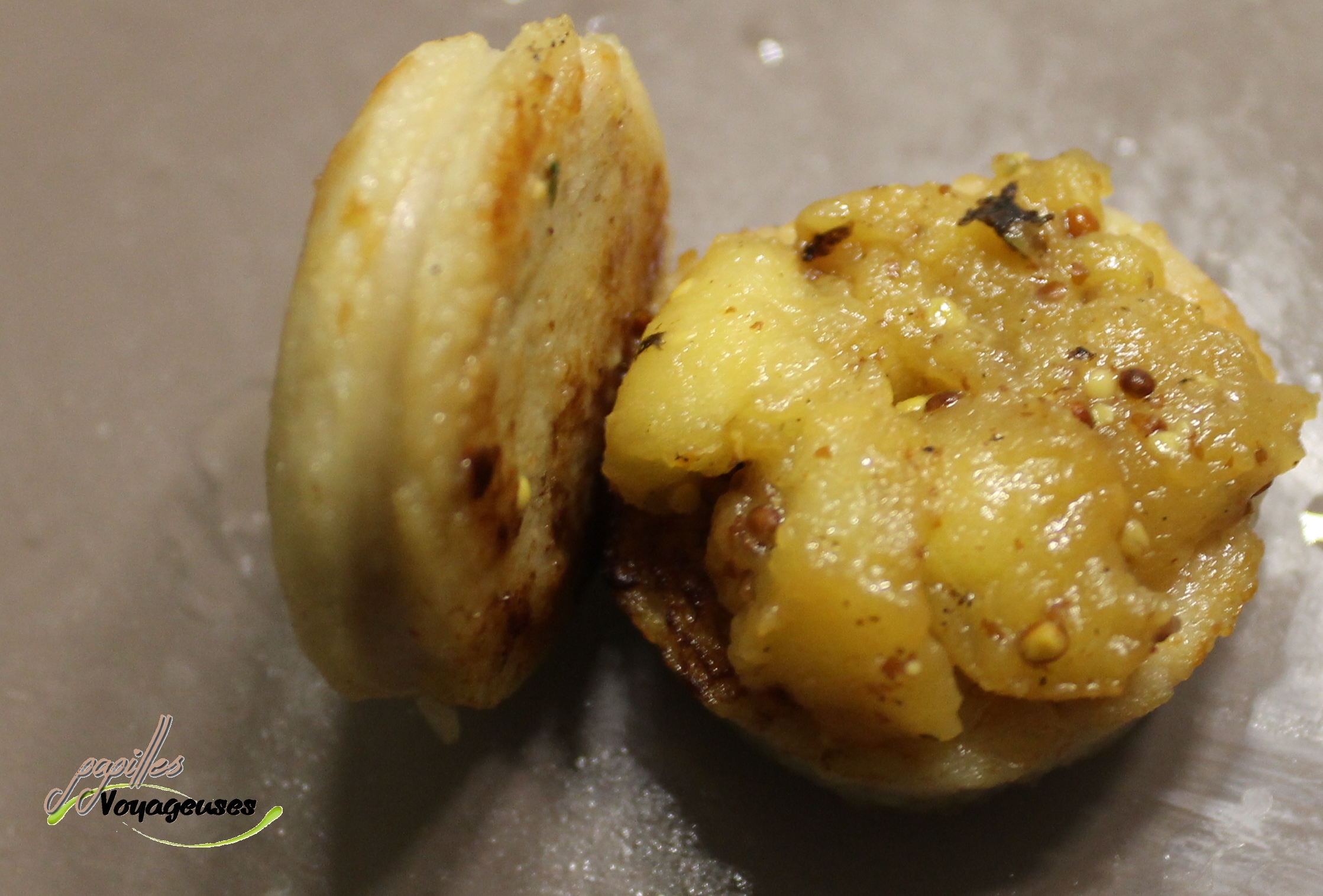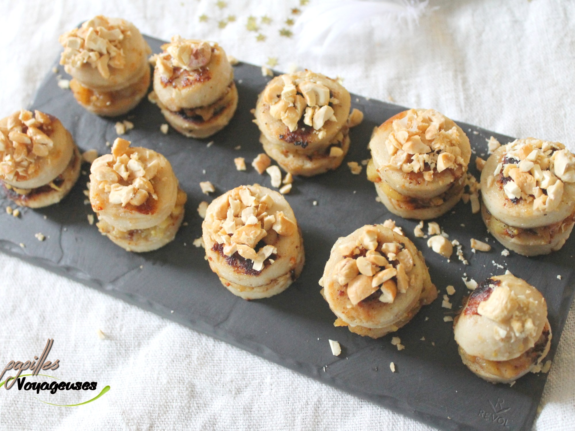 - Pendant la cuisson, concasser les noix de cajou puis monter votre apéritif: prendre une rondelle, tartiner un peu de compotée de pomme, poser par-dessus une autre rondelle. Pour finir disposer votre concassée de noix de cajou sur chaque woopies! A manger chaud, c’est mieux, sinon vous pouvez toujours faire réchauffer au dernier moment au four ou au four à micro-onde.