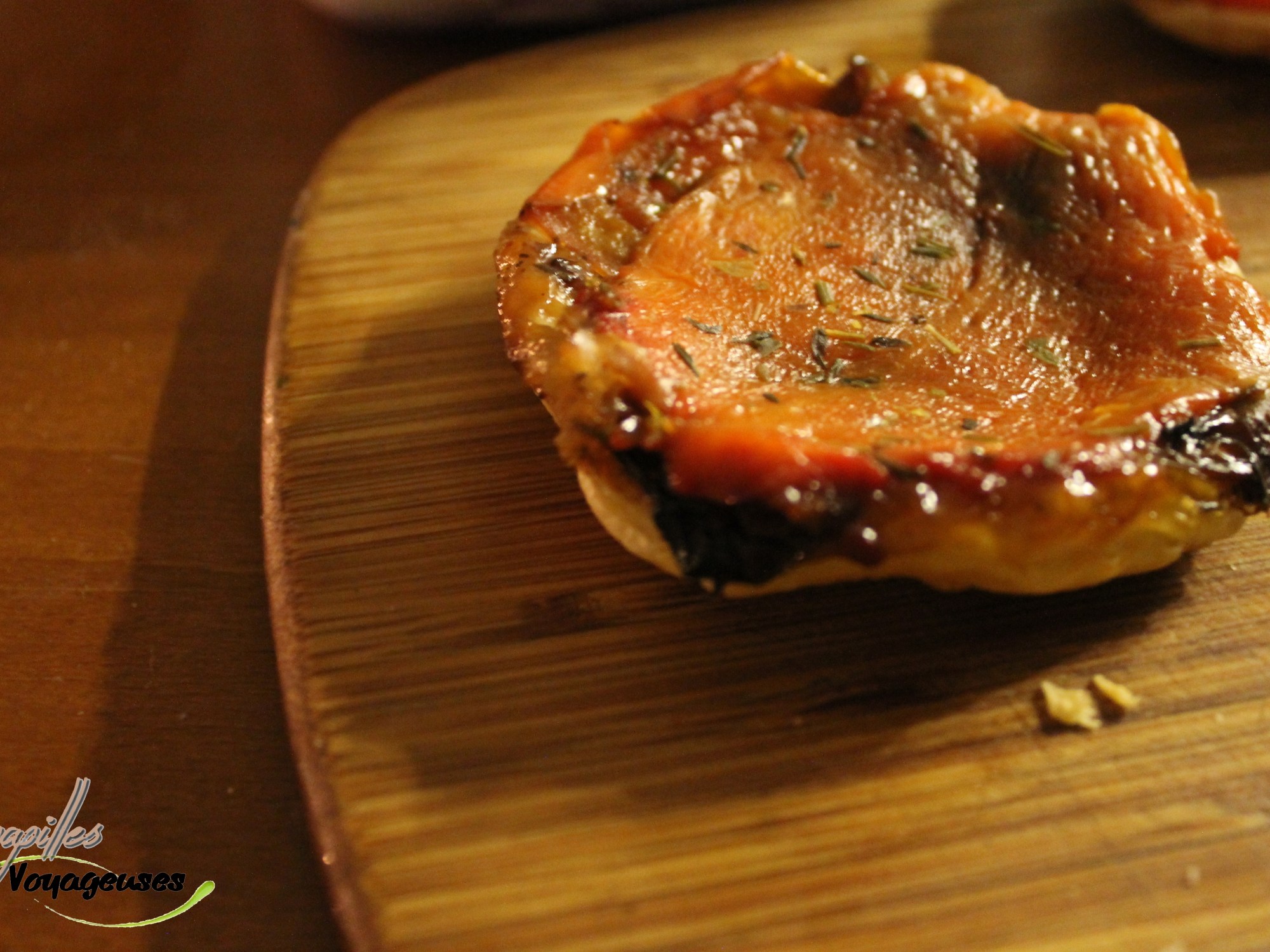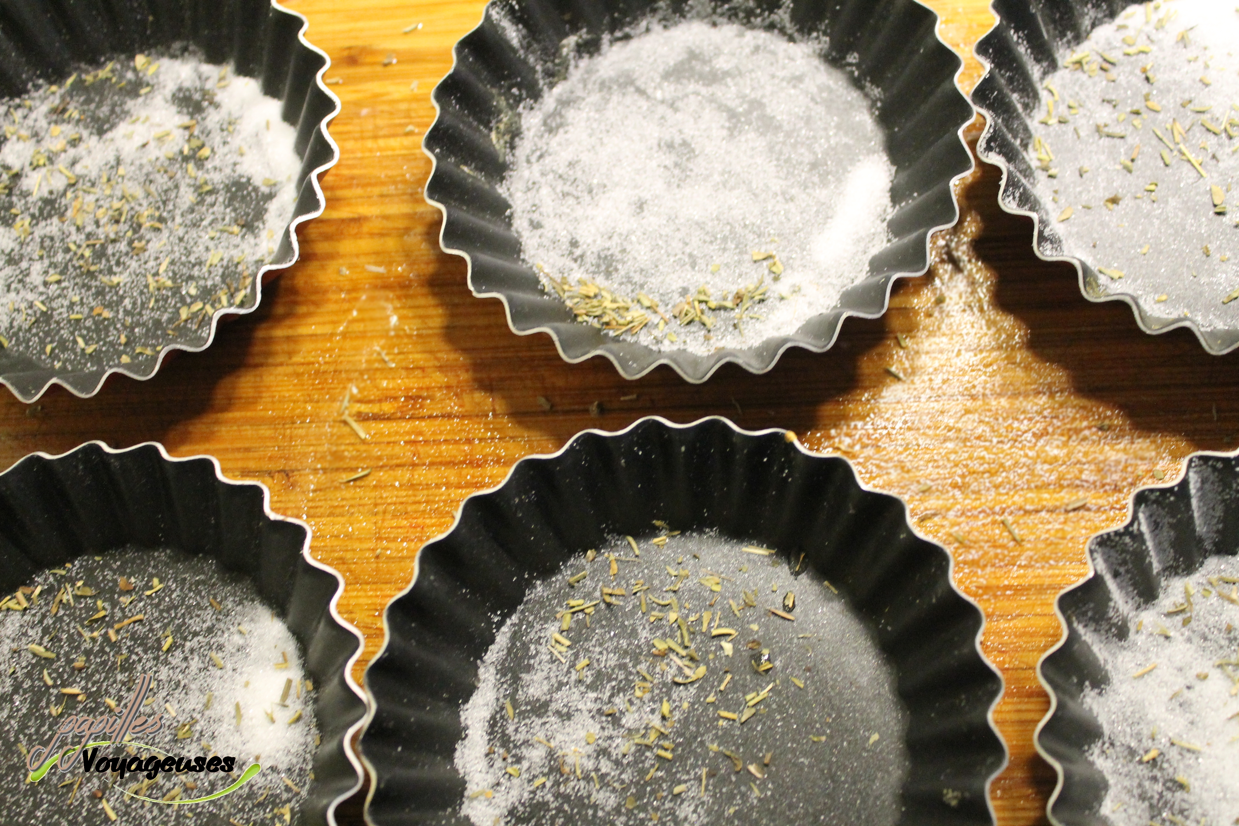 - Ajouter un peu d’échalote dans chaque moule puis une rondelle de mozza. Enfin, refermer le tout avec la pâte feuilletée uniformément et en refermant bien les bords.