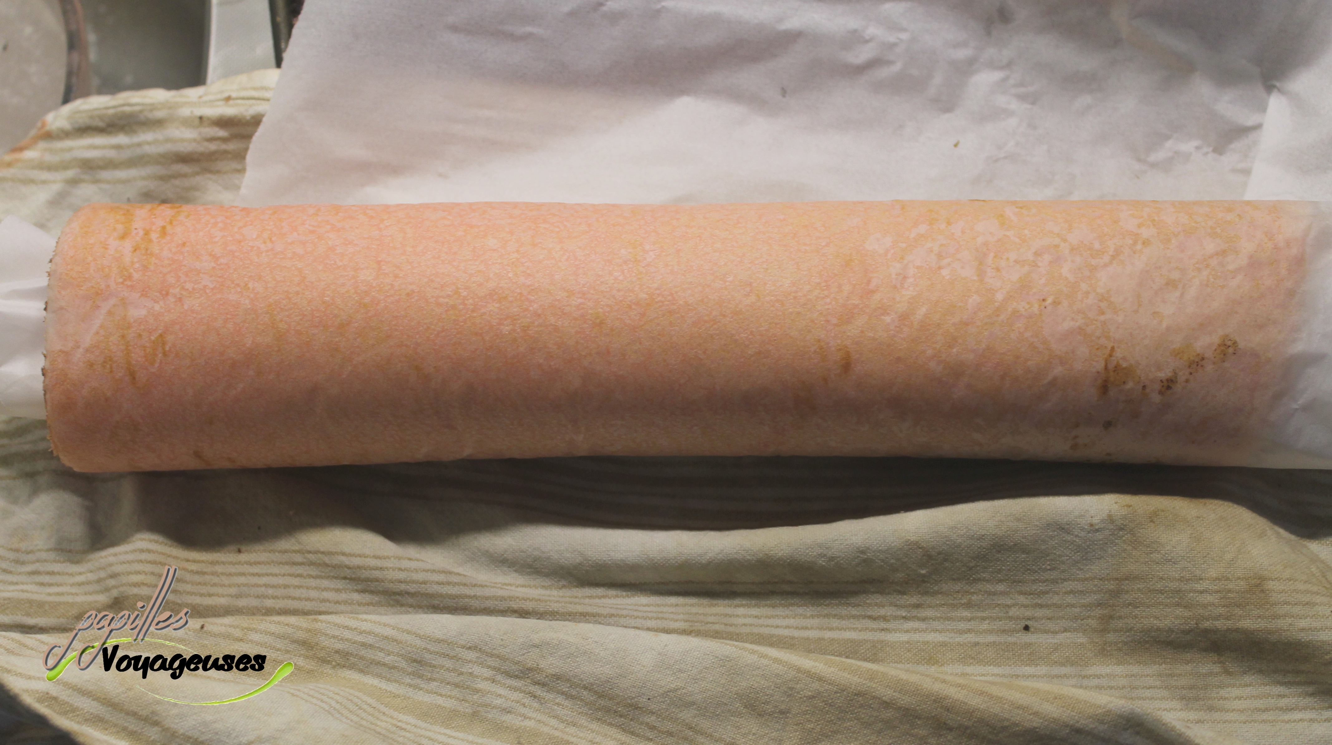 - Votre gâteau roulé doit être cuit: le sortir du four puis disposer une feuille de papier sulfurisé sur le gâteau. Prendre un torchon propre légèrement humide et le disposer par-dessus la dernière feuille de papier sulfurisé puis retourner votre gâteau sur le torchon. Rouler votre gâteau pendant qu’il est encore chaud avec le torchon (je l’ai roulé dans le sens de la largeur afin d’avoir un long gâteau). Laisser poser jusqu’à ce que le gâteau soit à température ambiante. Cela permet au gâteau de ne pas se briser lors du roulage final !