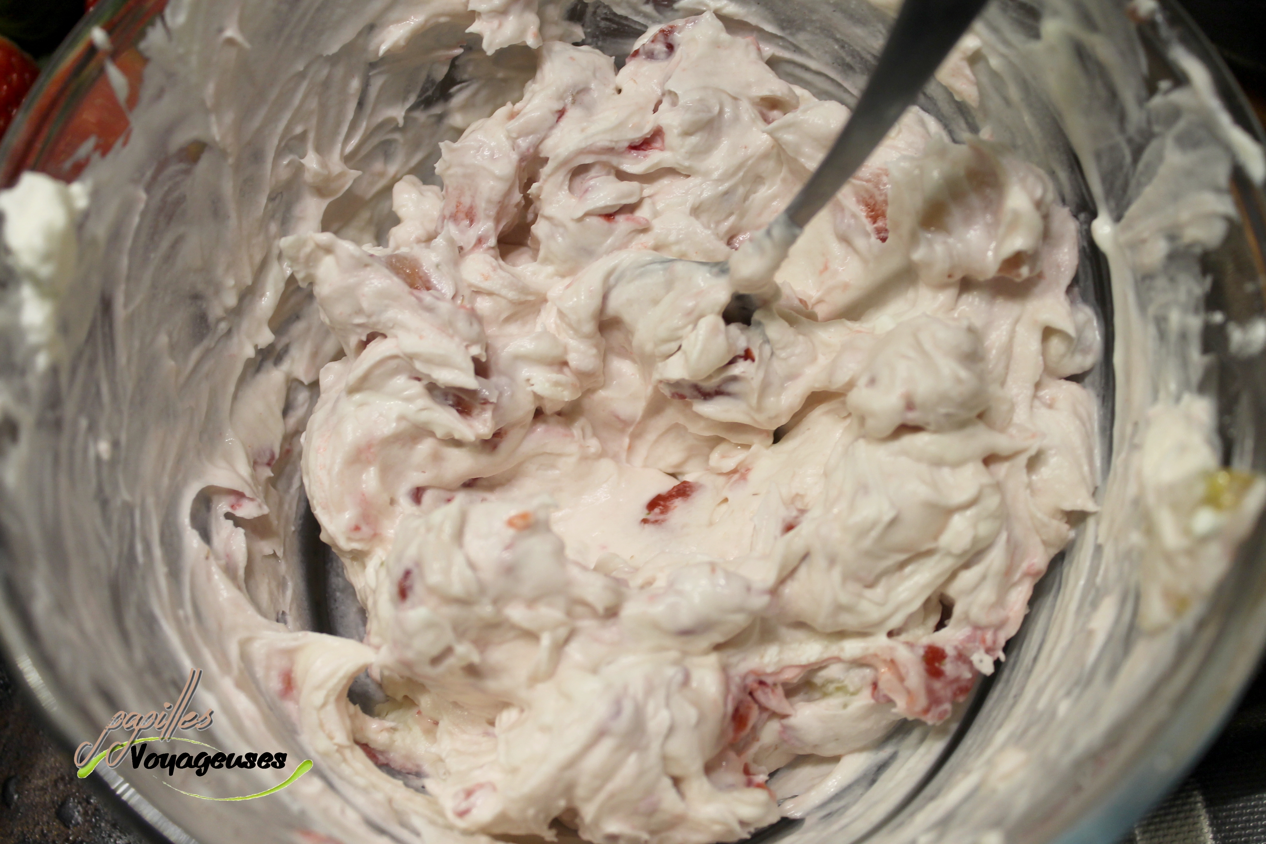 - Pendant ce temps préparer la garniture: Mélanger le mascarpone avec le sucre puis couper en petits dés les fraises et les incorporer au mélange. Attention à ne pas écraser les fraises afin que la garniture reste la plus blanche possible.