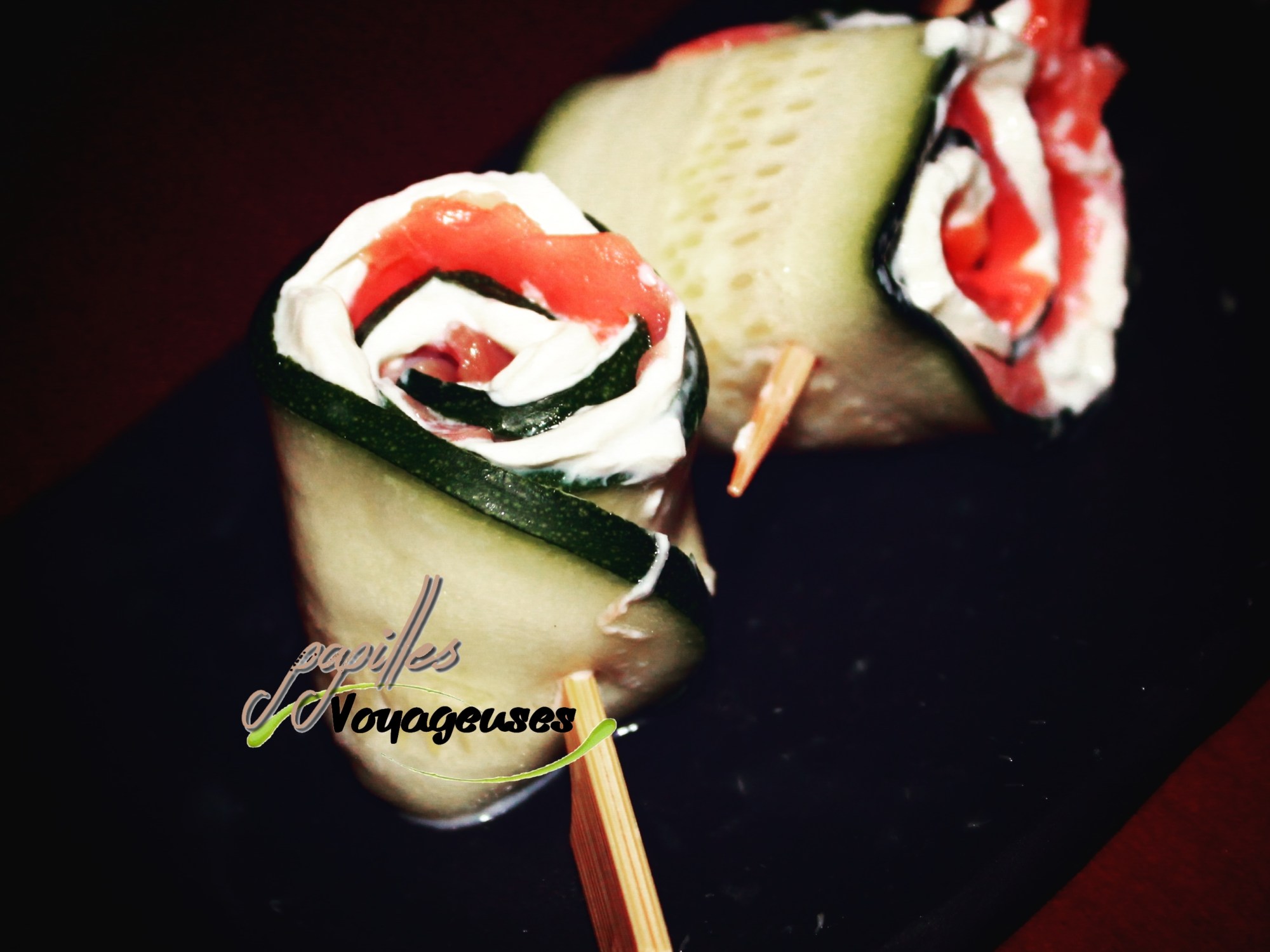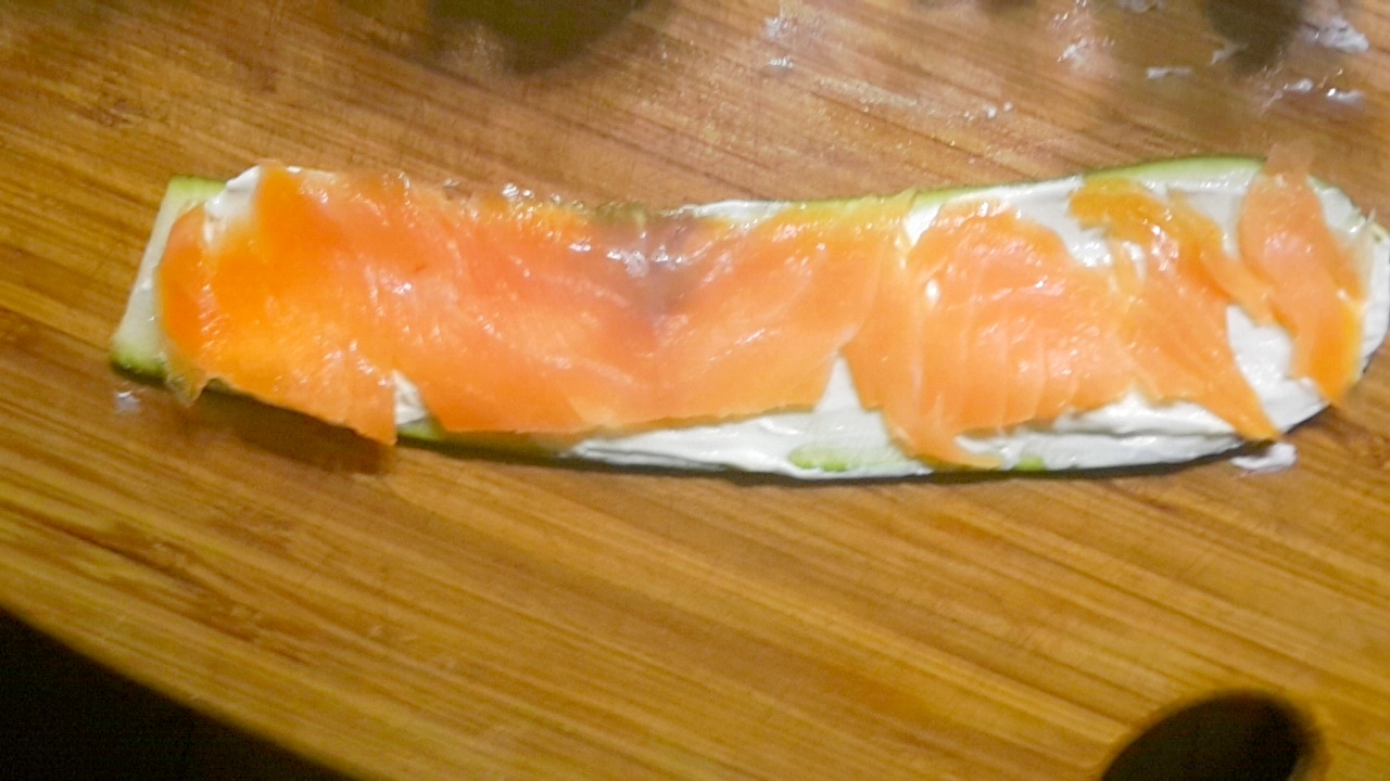 - Tartiner d’un peu de fromage frais vos tranches de courgette puis couper une languette de saumon fumé et la disposer sur votre préparation, puis rouler.