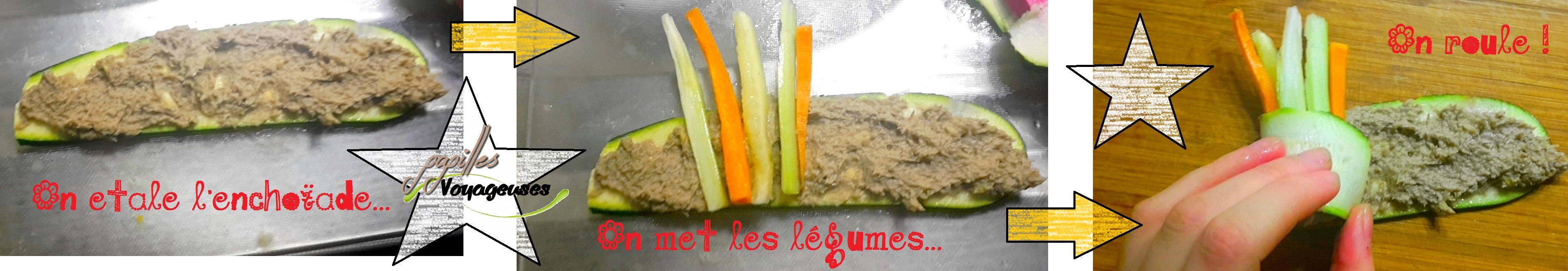 Il vous suffit de prendre une lamelle de courgette, d’y tartiner du fromage frais, et de disposer des bâtonnets de légumes puis de rouler le tout sur lui même.Faire de même avec l’anchoïade en remplaçant donc le fromage frais par l’anchoïade.