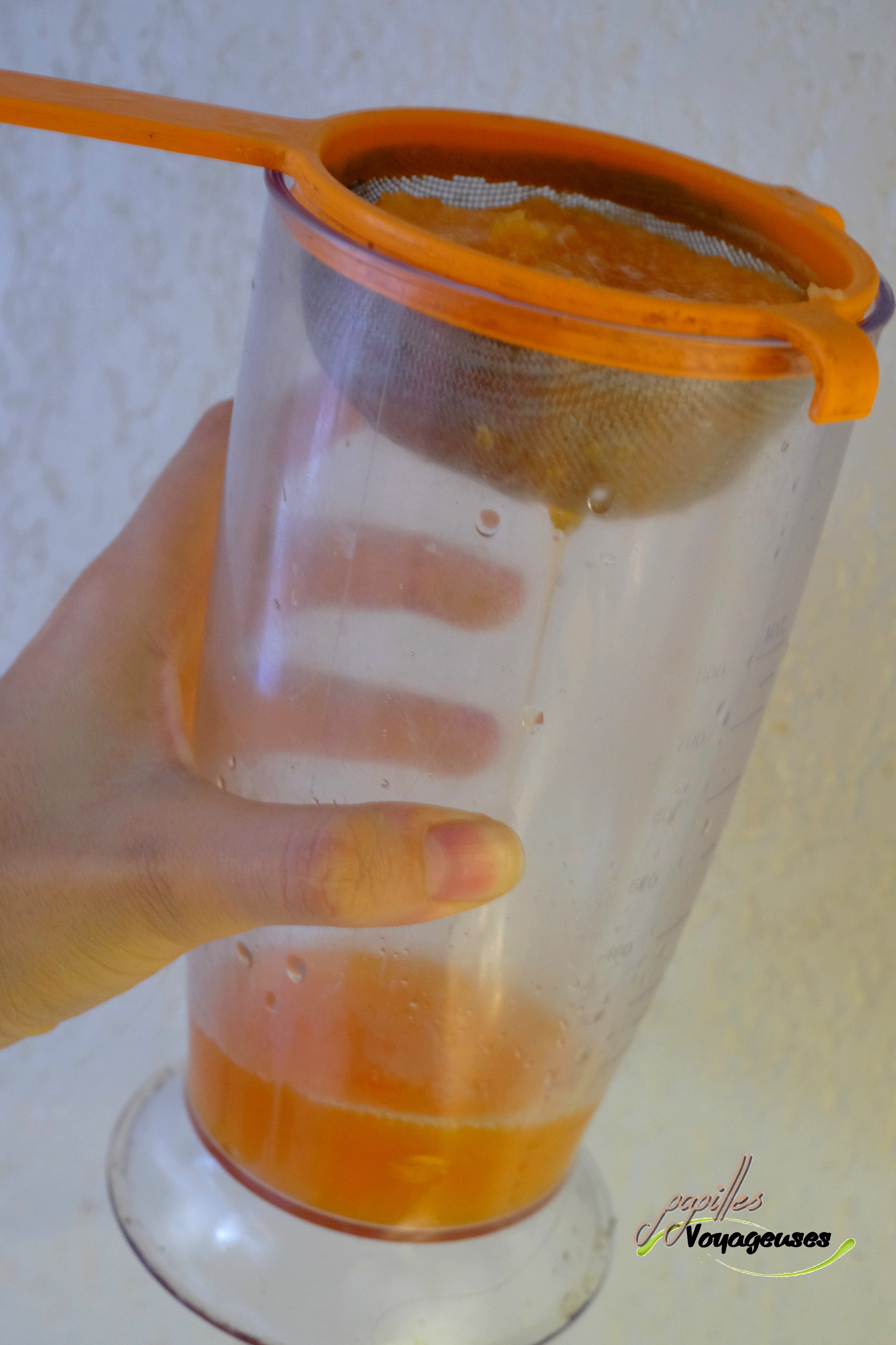 - N’ayant pas trouvé de jus de melon, je l’ai fait moi-même. Peler le melon, le mixer puis à l’aide d’un chinois, ne récupérer que le jus (voilà mon montage sur la photo). Assaisonner le jus avec du sel et du poivre.