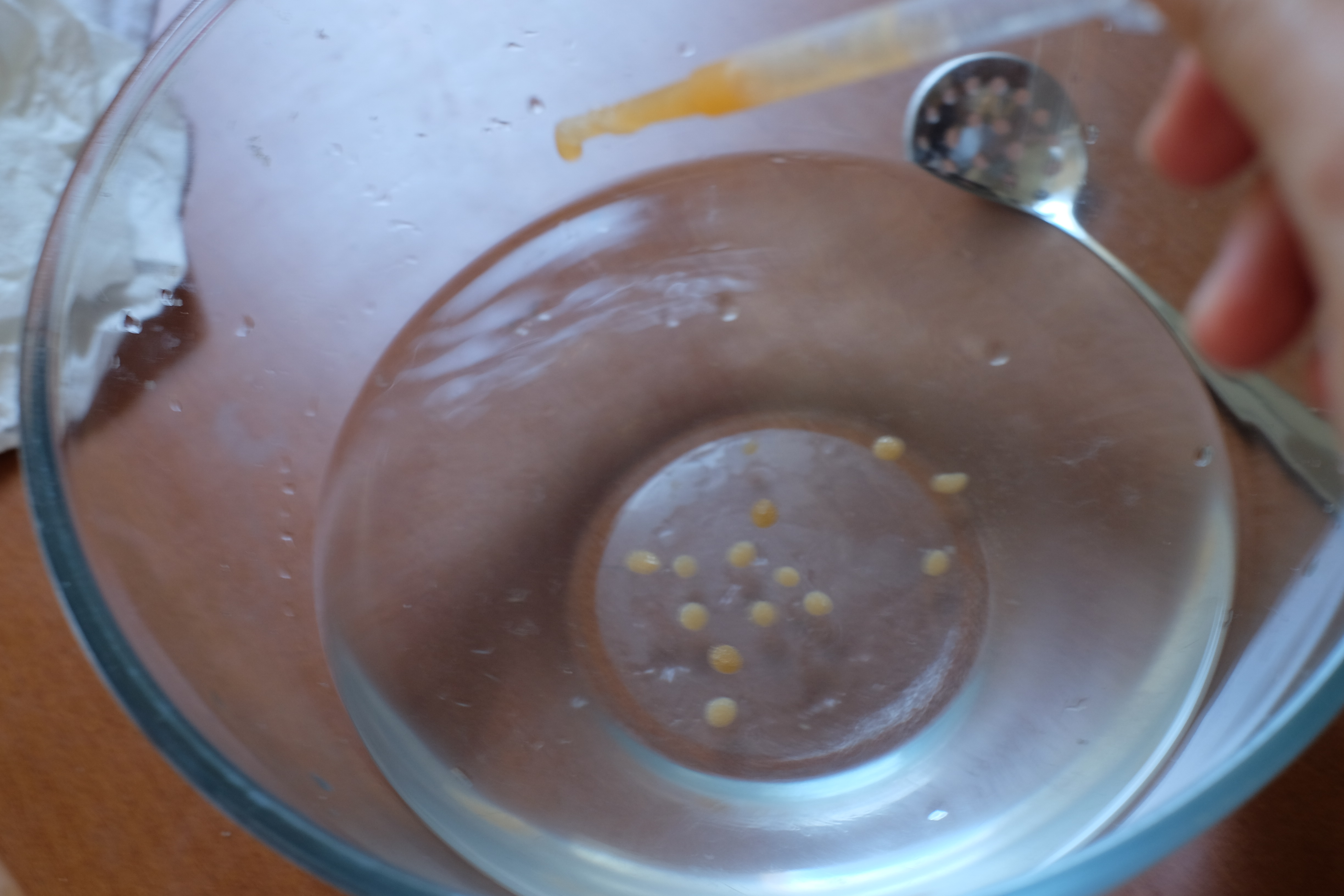 - Une fois le tout bien dissous, récupérer avec la pipette du jus de melon mélangé à l’alginate, et laisser tomber goutte par goutte le jus dans l’eau au lactate de calcium.
