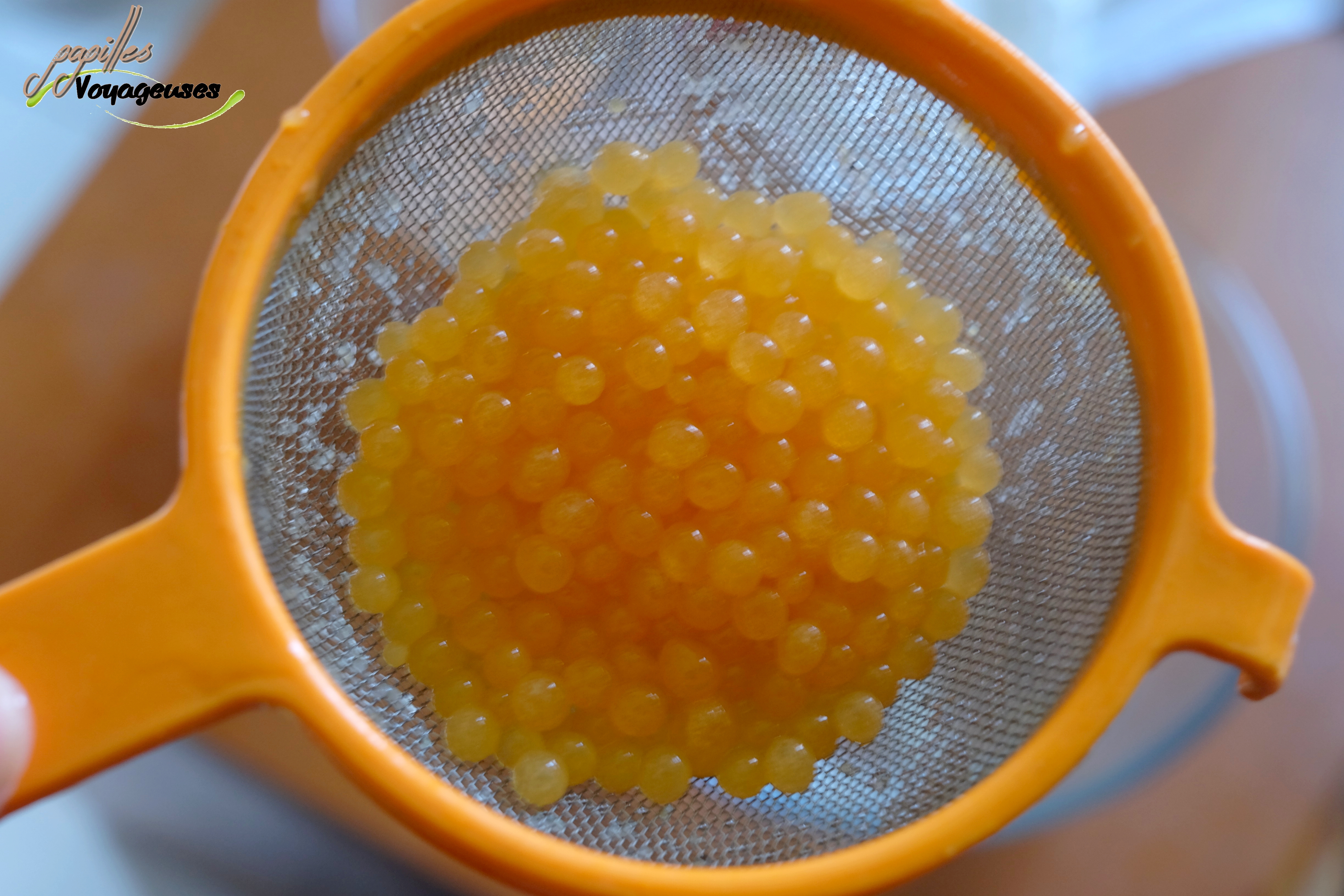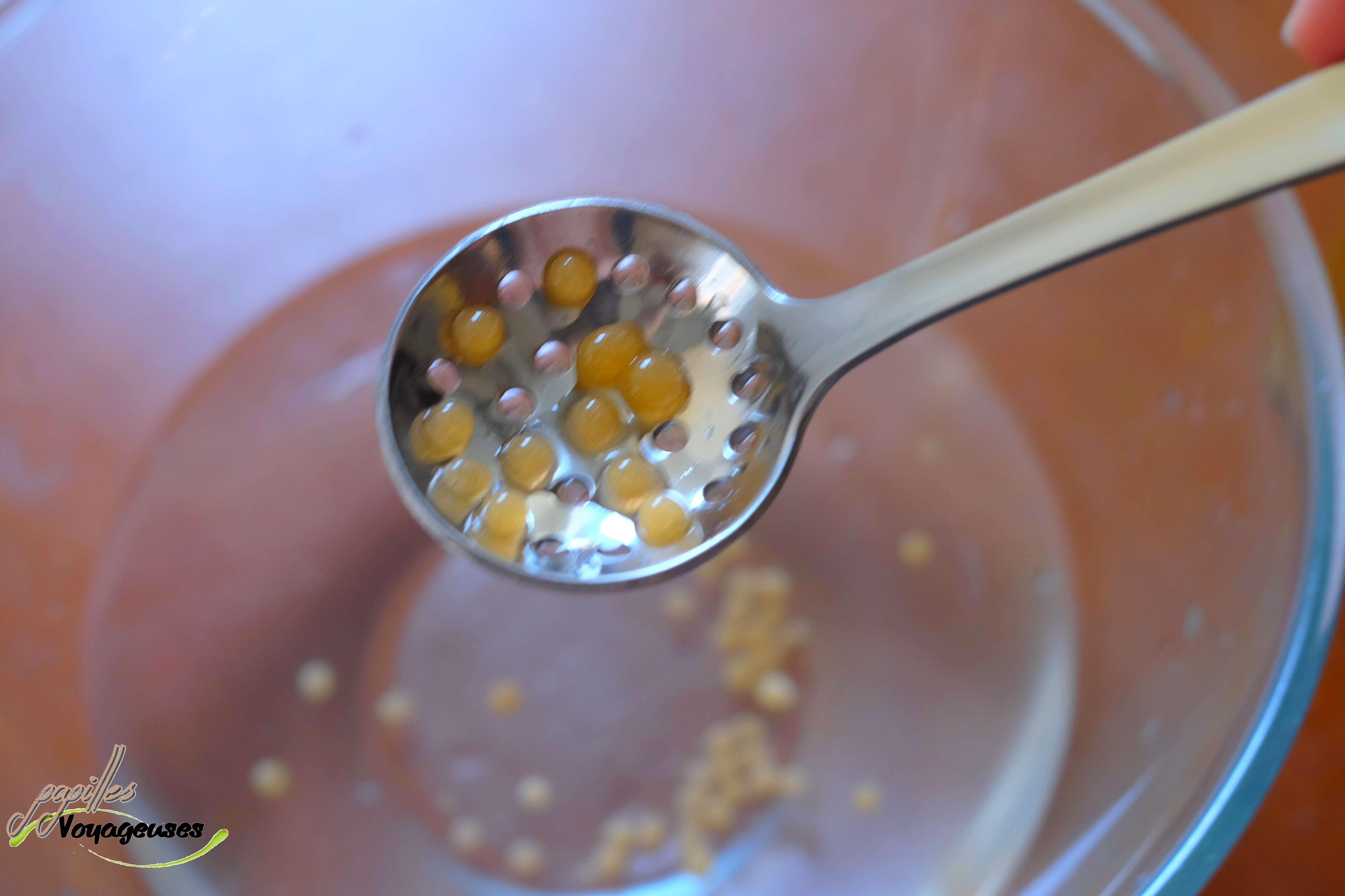 - Faire ainsi pendant 1 minute, puis récupérer vos billes à l’aide d’une écumoire ou d’une cuillère et les plonger dans le bol d’eau (cela permet de les rincer et d’arrêter la sphérification). Renouveler l’opération en tachant bien de récupérer les billes après 1 minute car l’intérieur de la bille doit rester liquide. Si votre bol d’eau est plein de billes, n’hésitez pas à récupérer les billes et les mettre dans un autre bol (sans l’eau) et récupérer de l’eau « propre ».