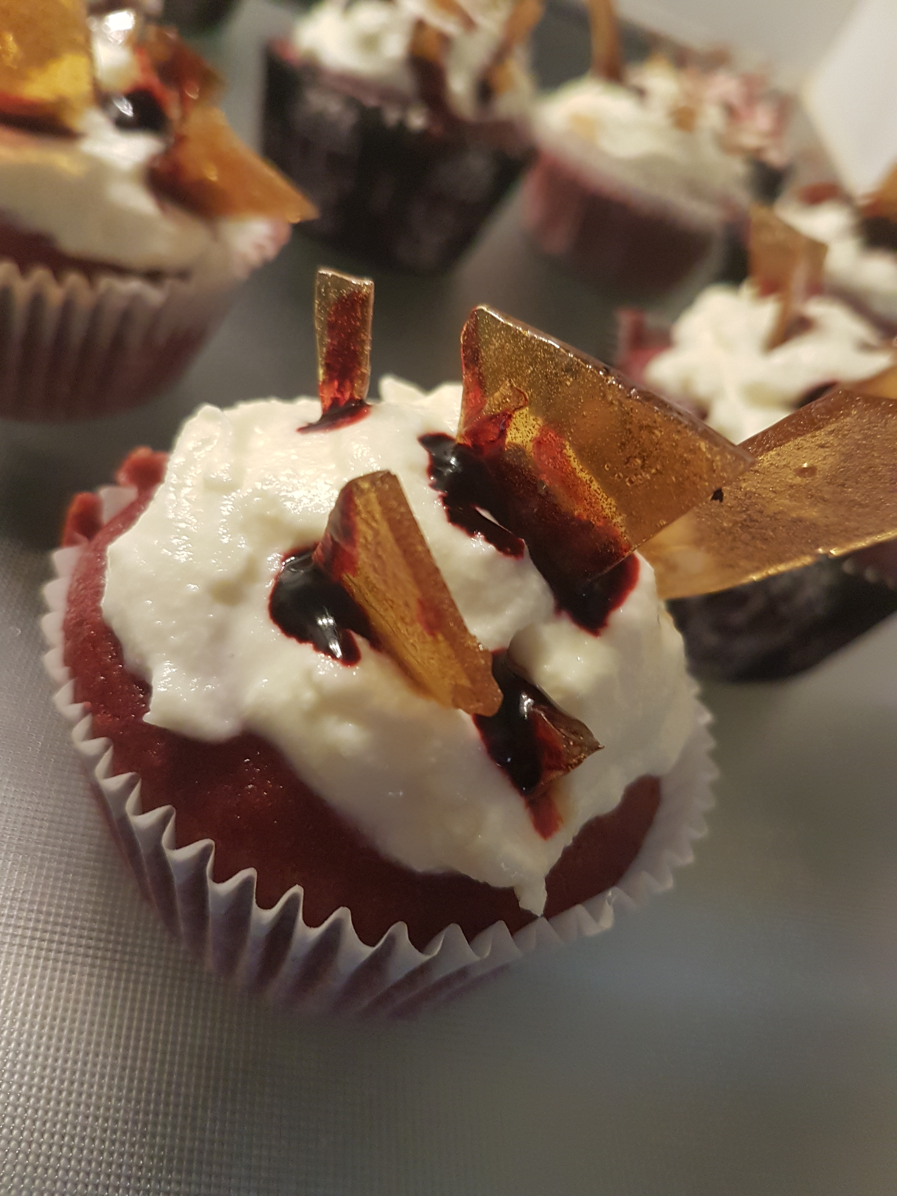 Les cupcakes sont en fait des »red velvet« . C’est une recette originaire du sud des Etats-Unis, c’est une génoise très légère, gout cacao et vanille, connue pour sa belle couleur rouge, parfaite pour Halloween! J’ai ensuite fait un glaçage au mascarpone, des faux éclats de verre en sucre et pour finir j’ai arrosé le tout avec du faux sang comestible.