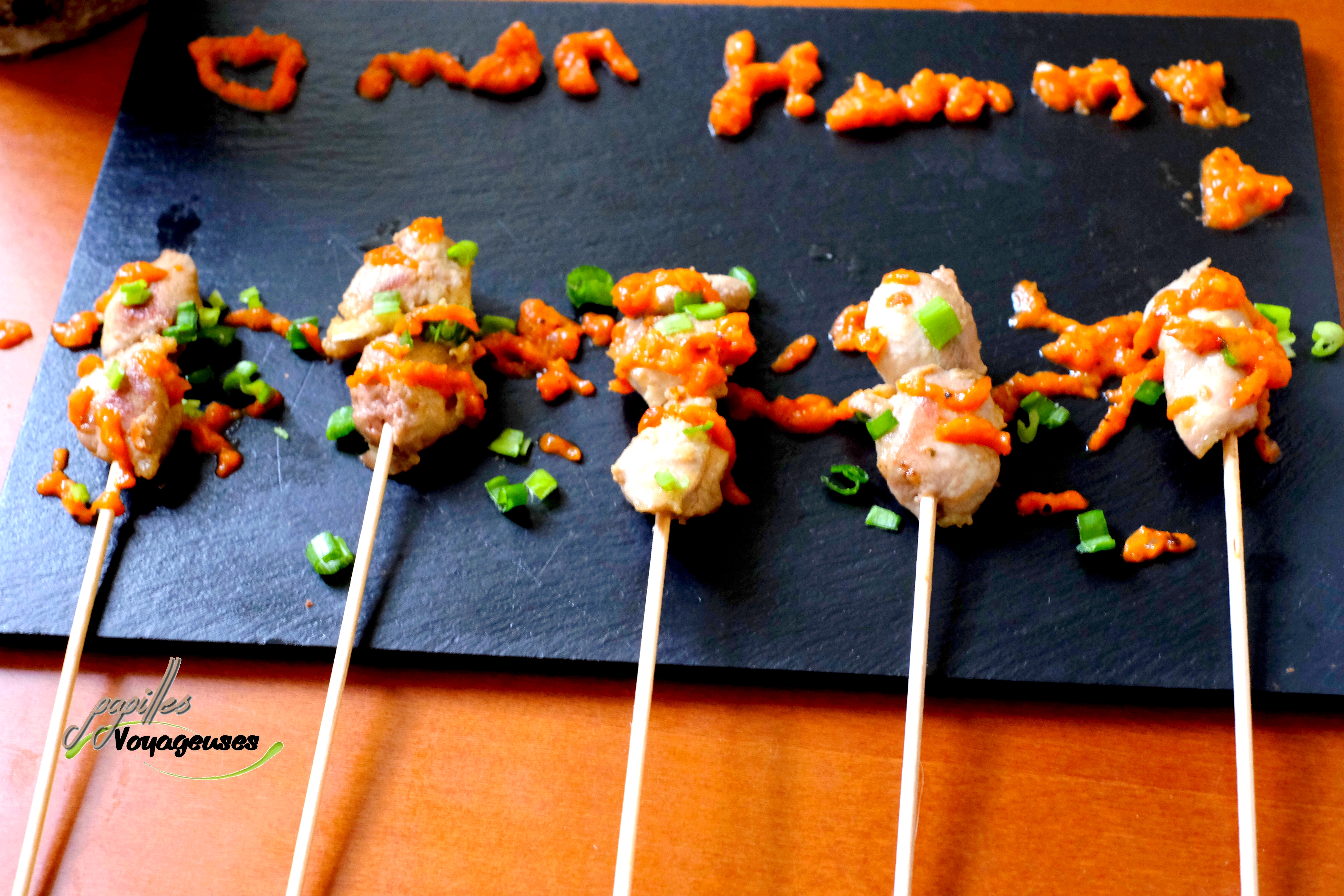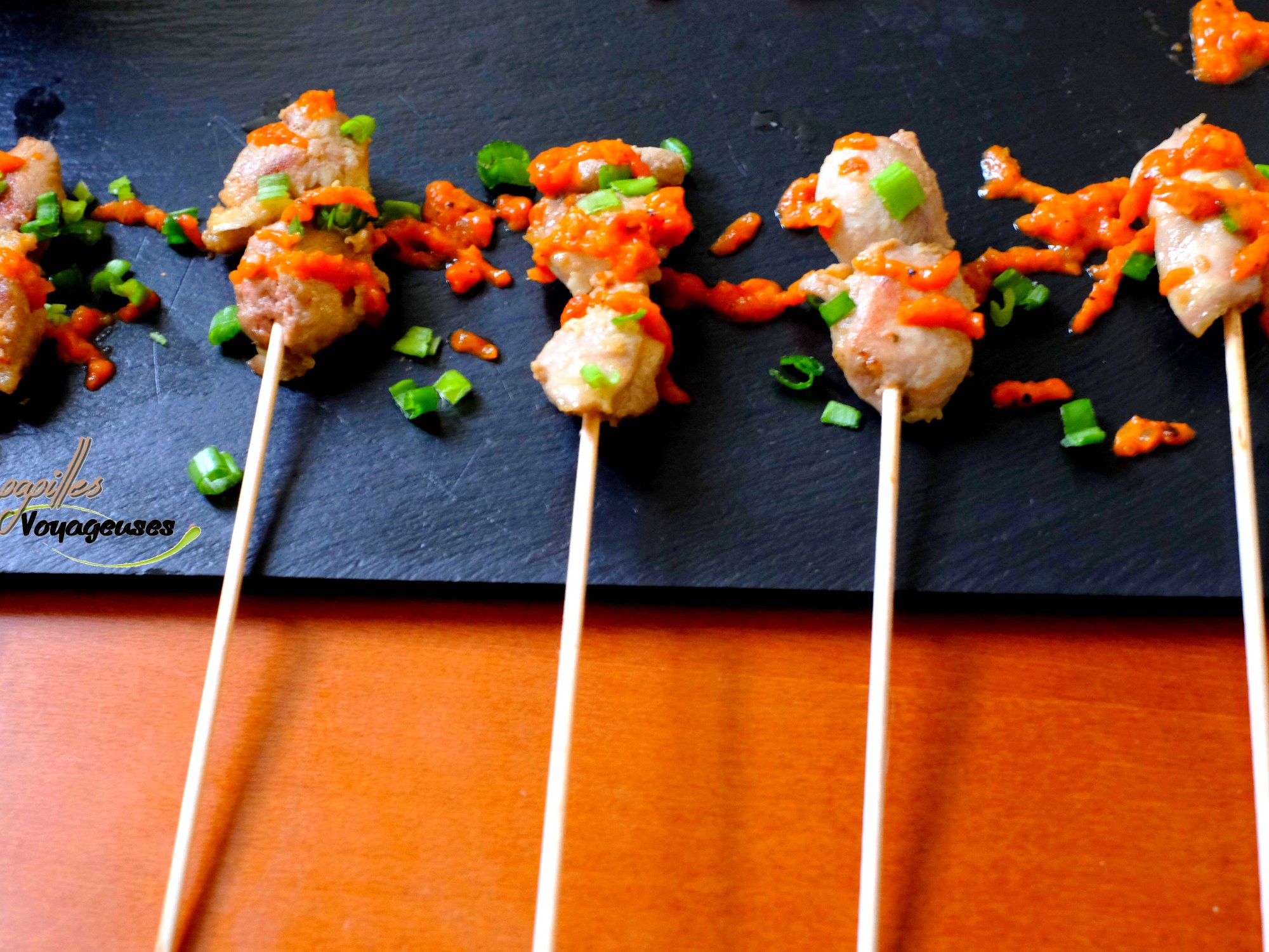 - Disposer le poulet dans un bol avec des piques ou sur des piques à brochette et servir avec la sauce au poivron et un peu d’oignon vert émincé (voir photo). Bon appétit!