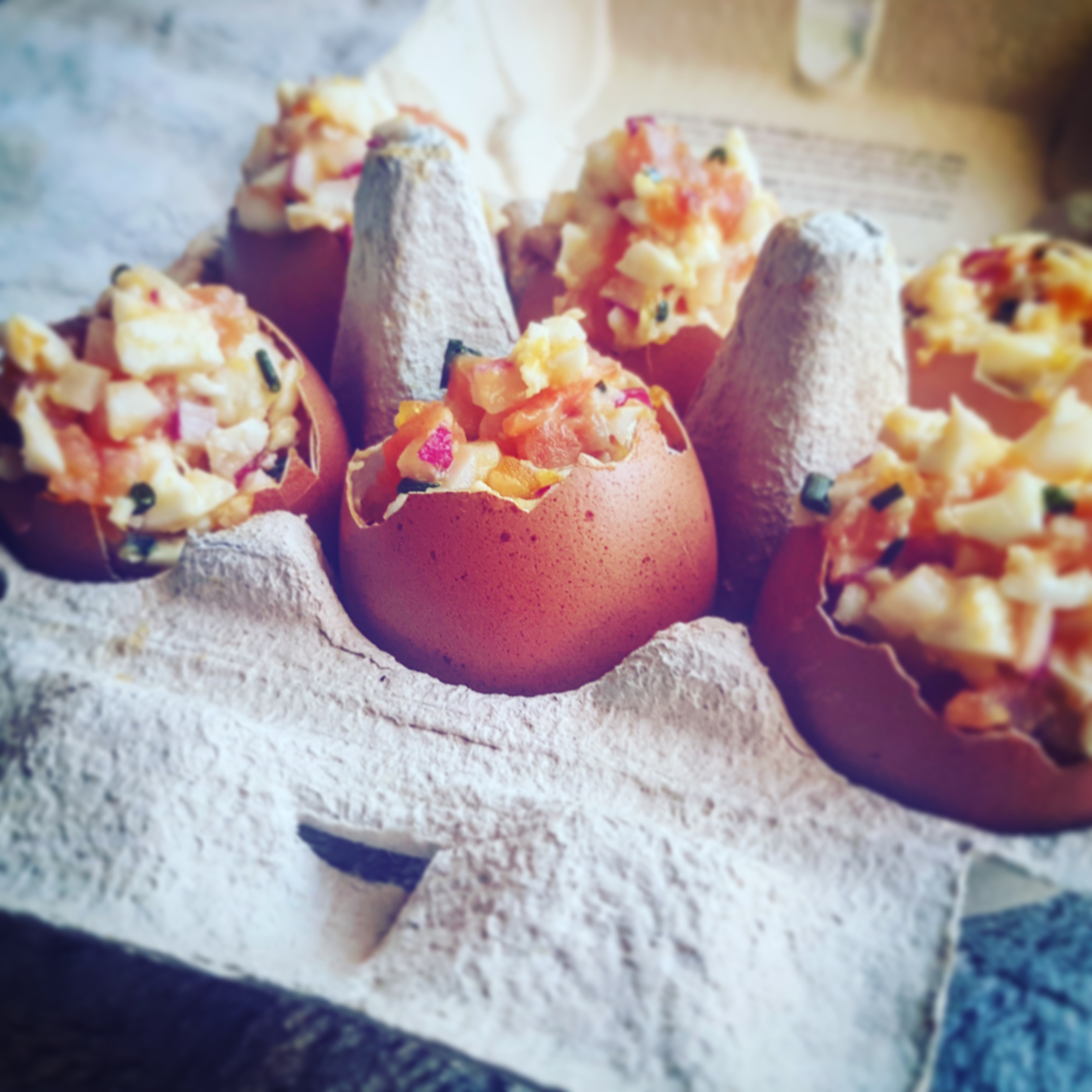 Le goût, le visuel, tout y est dans cette recette! Ces œufs « surprises » sont ici faits sous forme d’apéritif mais vous pouvez aisément mettre la farce dans des verrines ou en salade dans une assiette!