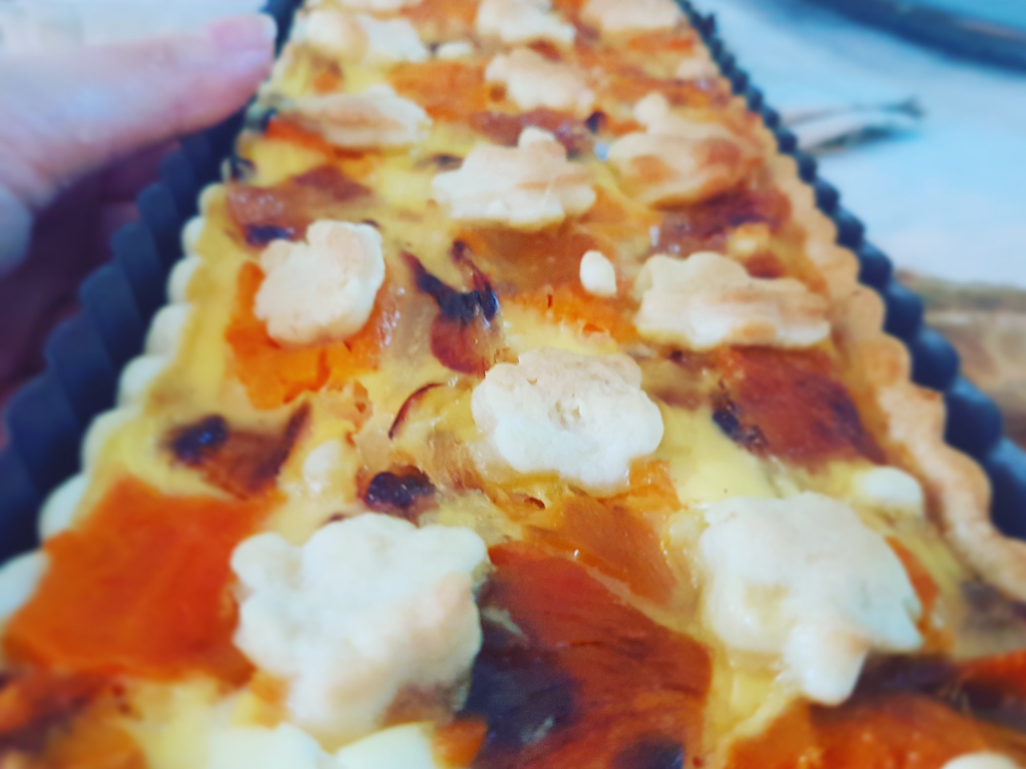 - Pour finir, déposer des cubes de patate douce, de feta et des oignons caramélisés sur votre pâte et verser par-dessus votre appareil œuf/crème liquide, enfin continuer la cuisson. – les petites fleurs sont faites avec la pâte restante, à l’emporte-pièce –
