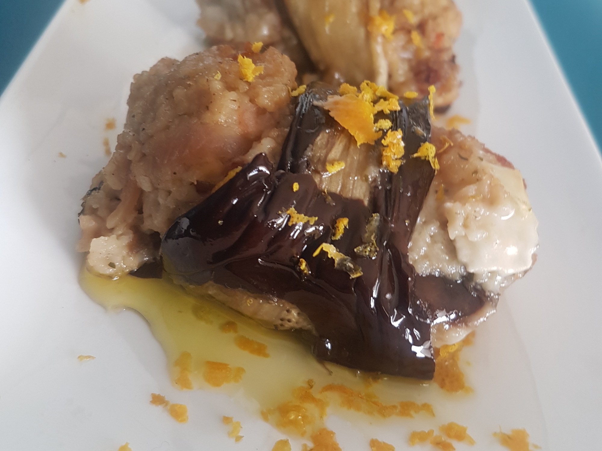 - Déposer sur le côté le plus fin de l’aubergine une bonne cuillère à soupe de préparation et rouler. Verser la sauce à l’orange (ou à défaut de l’huile) et déposer quelques zestes sur chaque rouleau. Comme je l’ai dit précédemment, vous pouvez les préparer à l’avance et les déguster chauds ou à température ambiante.