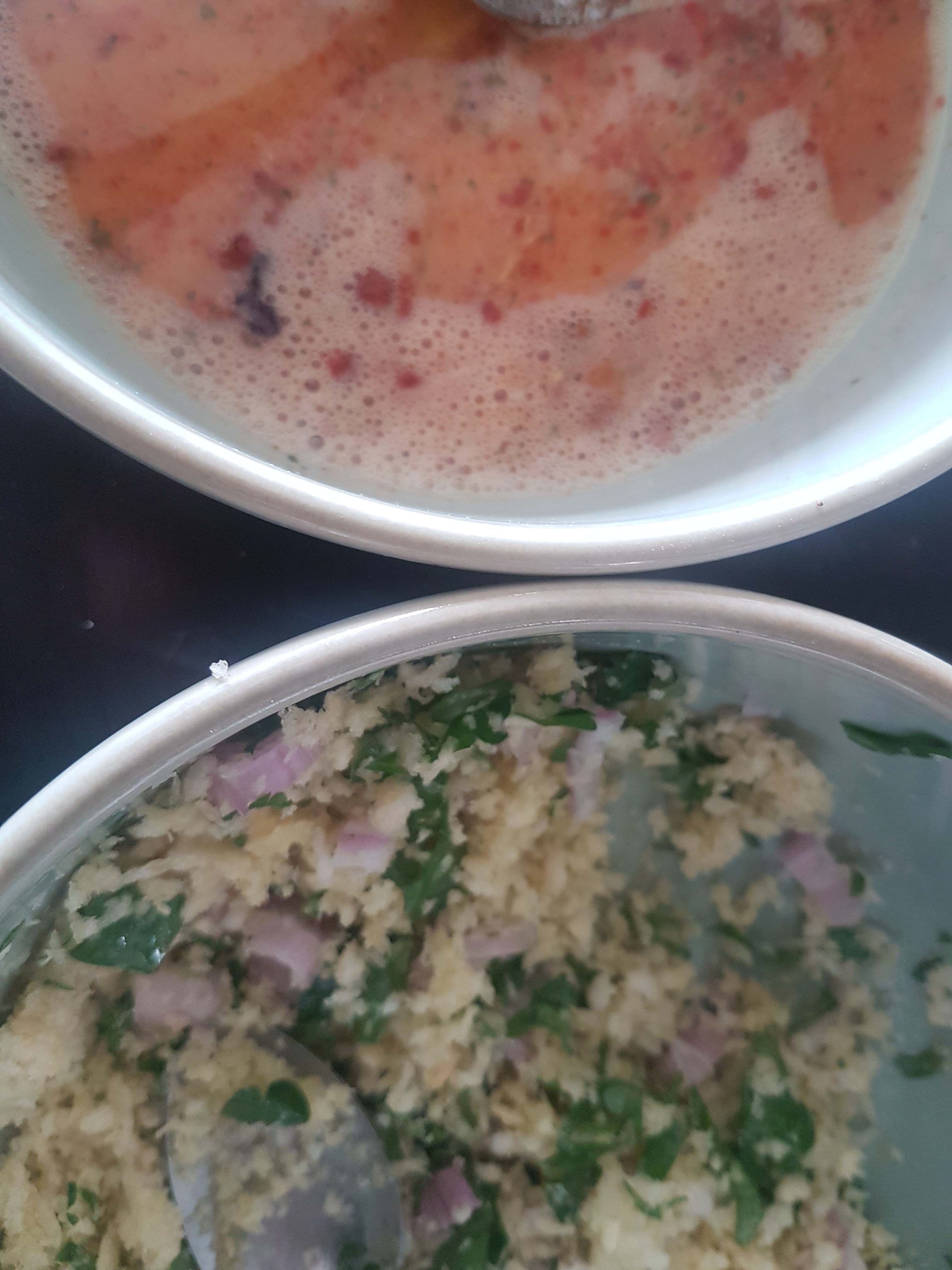 - Dans une autre assiette, battre les œufs et ajouter le sel le poivre et le paprika.